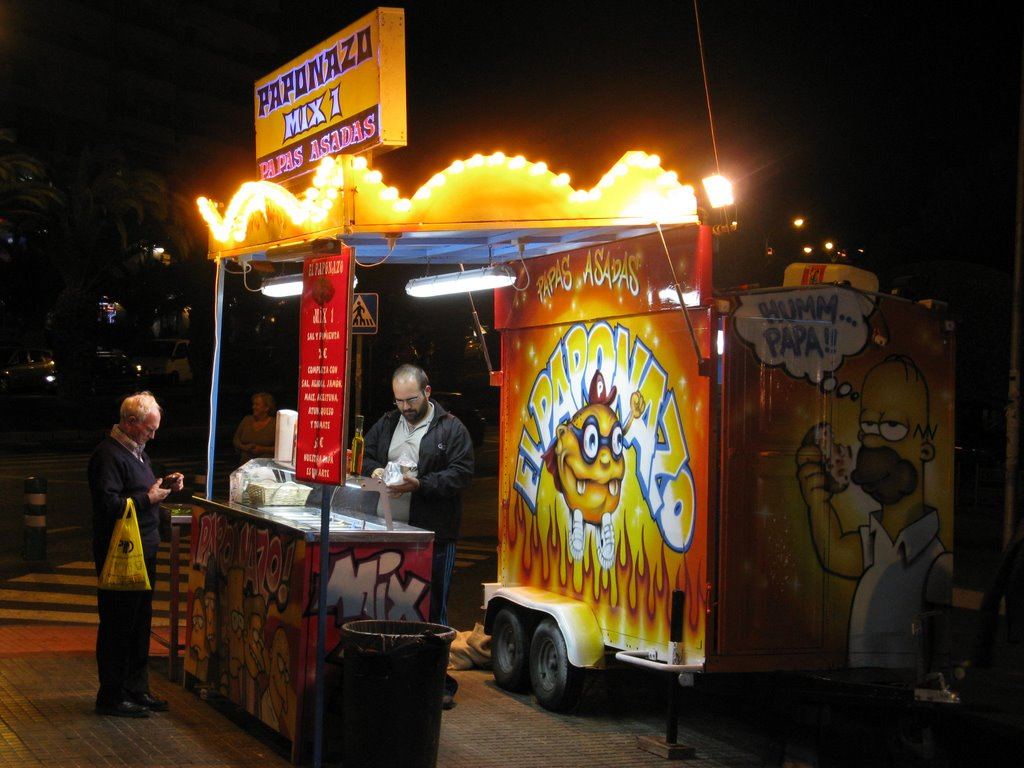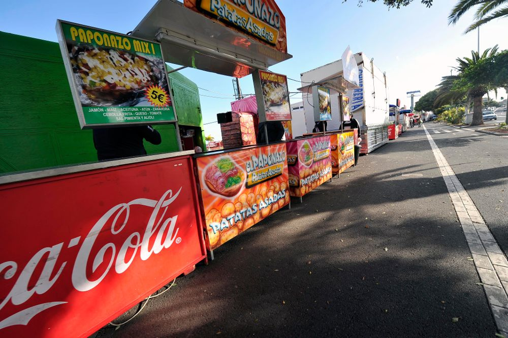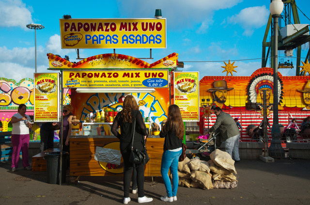 Santiago Martín ist Eigentümer eines solchen Verkaufsstands in Santa Cruz. Er ist Präsident der Schaustellervereinigung und schon sein ganzes Leben lang mit den Karnevalsständen von Santa Cruz verbunden. In der dritten Generation betreibt seine Familie die berühmten Stände mit Karnevalsartikeln in der Calle El Castillo sowie mehrere Stände mit Hot Dogs, Hamburgern und Sandwiches. Und natürlich sind im Februar auch Paponas im Angebot. Wer nicht unbedingt die Fleischberge aus den großen Pfannen essen will, freut sich vielleicht über eine große Kartoffel.