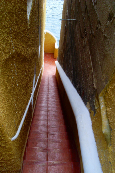 Noch spannender wird es, wenn man vom Parkplatz aus nach links geht. Dort führt ein schmaler, mit einem wackligen Geländer gesicherter Weg unter einem Felsüberhang hindurch zu abenteuerlich an die Felsen geklebten Hütten. Unglaublich, dass man dort wohnen kann. Hier ist man wirklich im Abseits.
