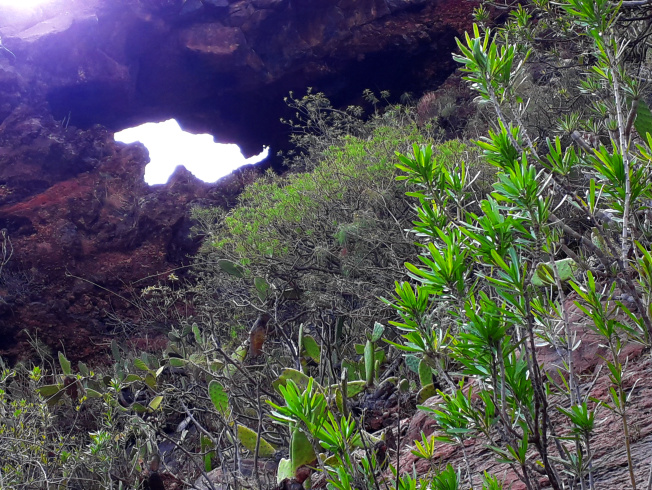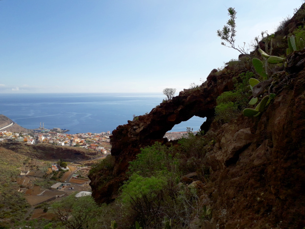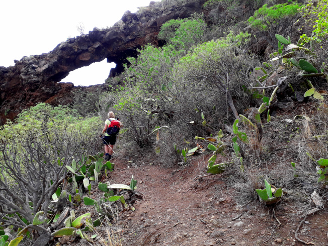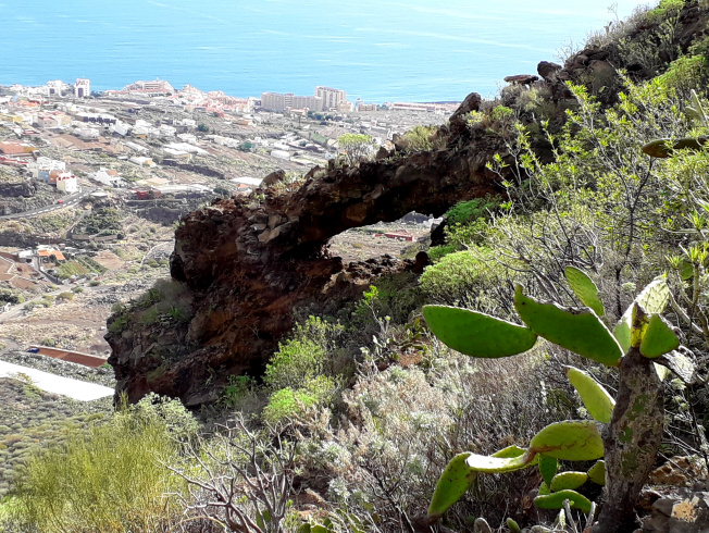 Der Weg Nr. 296 steigt zuerst leicht, dann steiler den Hang hinauf. Je mehr man an Höhe gewinnt, desto besser wird die Aussicht hinunter nach Candelaria und zur Küste. Man sieht das Kraftwerk von Las Caletillas und die Autobahn. Bald entdeckt man auch den imposanten Felsbogen, zu dem ein schmaler Weg hinüber führt. Man kann hindurch und hinunter zur Küste schauen, aber leider nicht direkt bis unter den Bogen gehen, ohne eine waghalsige Kraxelei zu riskieren. Vorsicht! Man kann straucheln und fallen, ja sogar abstürzen!