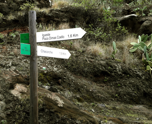 150m danach trifft man auf die Beschilderung der offiziellen Wanderwege SL TF 296 und SL TF 296.2.Letzterer weist in den Barranco Chacorche hinein. Der Weg Nr. 296 geht über La Mesa nach Araya. Wer mag, kann zunächst den folgenden Abstecher zum Felsentor machen, der aber etwas steil ist.