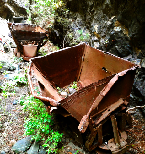 Plötzlich taucht nach einer Biegung der Schlucht eine Kanalbrücke auf, die von einem Wasserhaus links oben kommt. Kurz danach steht man am Ende des Wegs. Hinter den verrosteten Transportloren und Schienen entdeckt man den Ausgang der Galería, die mit einem Gittertor verschlossen ist. Der Wasserstollen von Chacorche ist einer der vielen, die es hier auf der Ostflanke der Berge gibt. Er reicht 3120m tief ins Innere des Gebirges und wurde 1932 gebaut. Seine Wasserschüttung schwankt zwischen 33 und 133 Litern pro Sekunde, laut eines Dokuments von 1934. Der „Plan de Obras Hidraulicas“ des Cabildo von 1961 gibt eine Schüttung von 740 Pipas pro Stunde an, was etwa 100 Liter pro Sekunde entspricht. (In ganz Teneriffa werden Wassermengen auch heute noch in Pipas angegeben, 1 Pipa = 480 l)