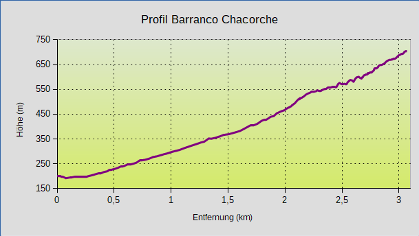 Der Wanderweg in den Barranco Chacorche wurde im Jahr 2003 für 18500 € verbessert und ausgeschildert, davon wurden 60% aus dem Subventionsprogramm zur Entwicklung ländlicher Regionen des Landwirtschaftsministeriums finanziert, den Rest trug die Gemeinde Candelaria. Der Weg von der Galería hinunter durch die Schlucht bis zum Friedhof ist etwa 3,2 km lang, man schafft den Rückweg bequem in etwa 75 Minuten.