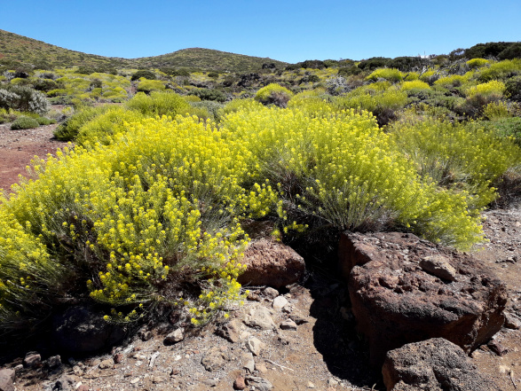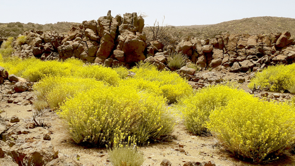 In der Ebene blüht im Frühjahr ein Busch namens Hierba pajonera (Descurainia bourgaeana) mit einer üppigen gelben Blütenpracht. Die kleinen blauen Blüten des Alhelí (Erysimum scoparium) gehören zu den schönsten im Nationalpark. Und der stachlige Codeso (Adenocarpus viscosus) bildet ganze Teppiche mit prächtigem Gelb.