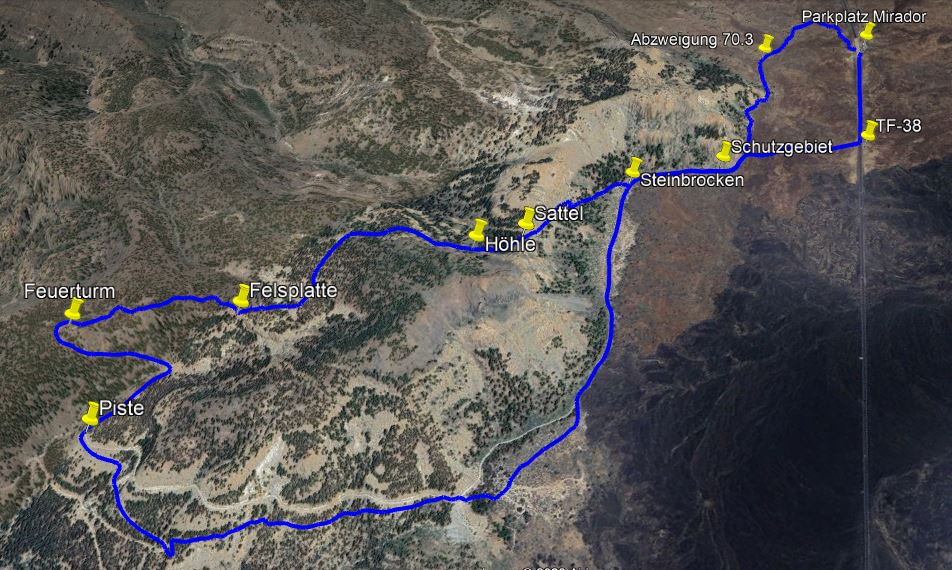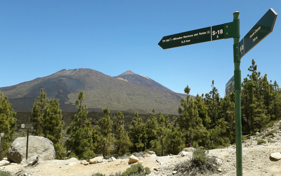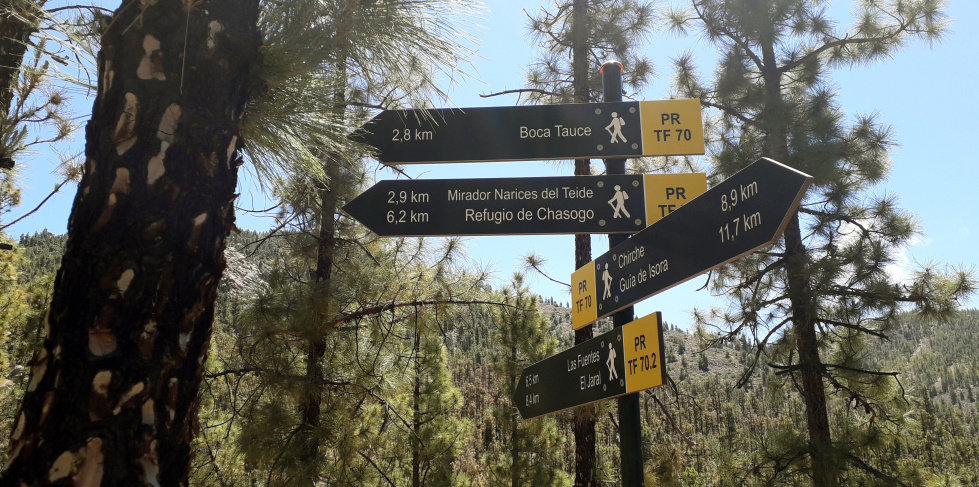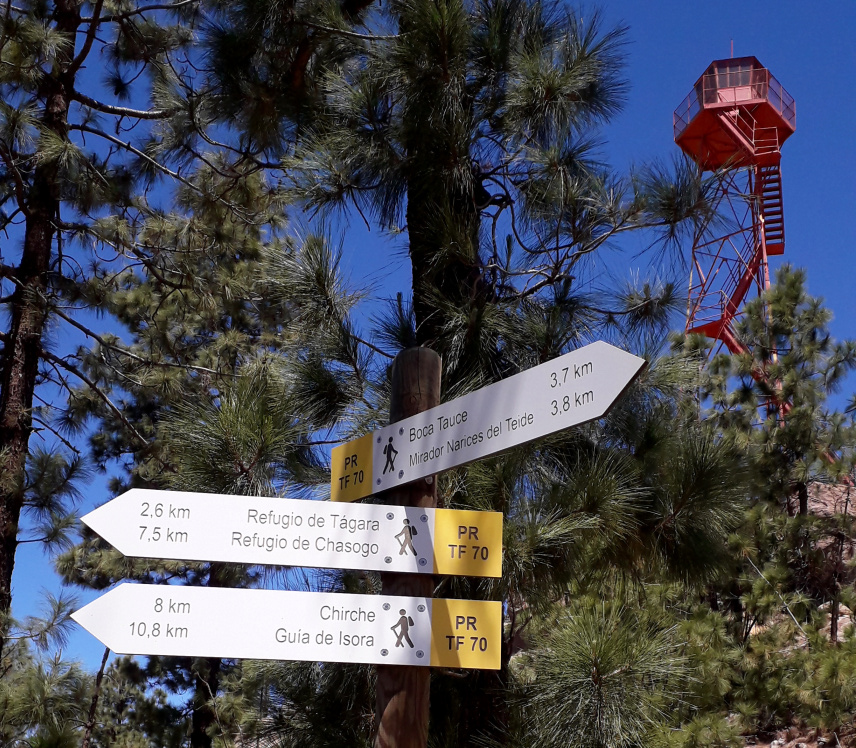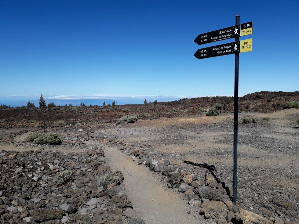 Nach einer Kurve unterhalb des Turms zeigen die Wegweiser den Wanderweg TF 70 nach Guía de Isora an, ebenso wie der Rückweg zum Mirador Narices del Teide. Er verläuft noch ein Stück bergab auf der Piste, bis er in einer Linkskurve auf eine andere Piste trifft. Hier könnte man nach links oben gehen und immer dieser Piste folgen. Schöner ist es aber, die untere Piste zu gehen und den ausgezeichneten Wanderweg zu benützen. Ein Stück weiter unten zweigt dieser in einer scharfen Rechtskurve ab und steigt dann mal steil, mal weniger steil hinauf, bis man wieder auf die obere Piste trifft.