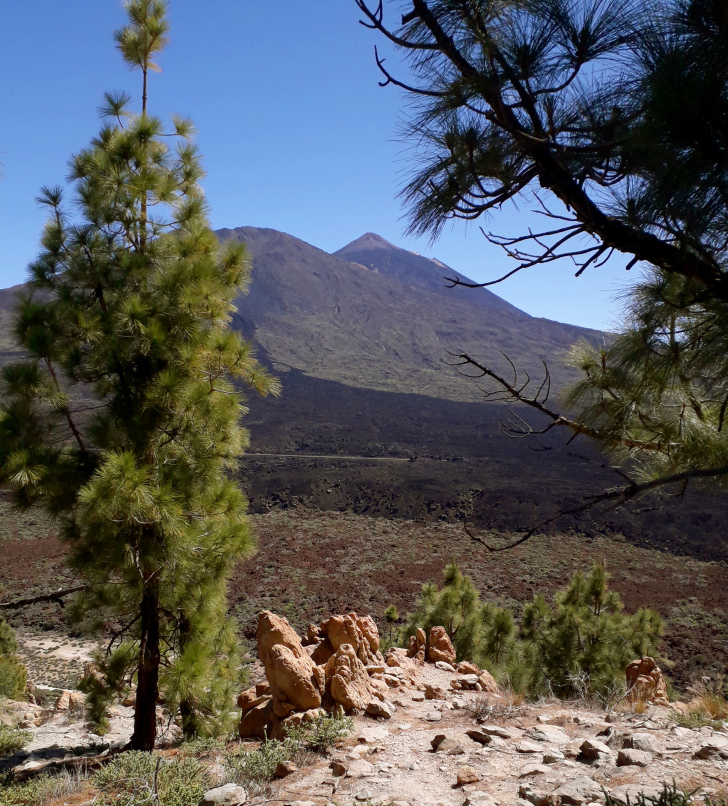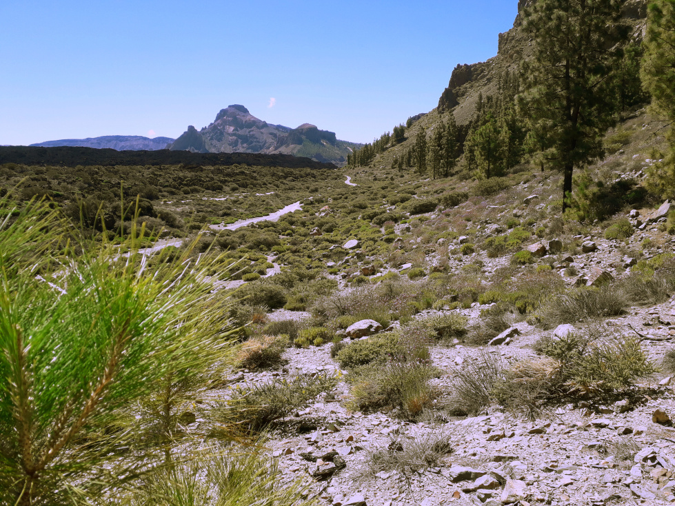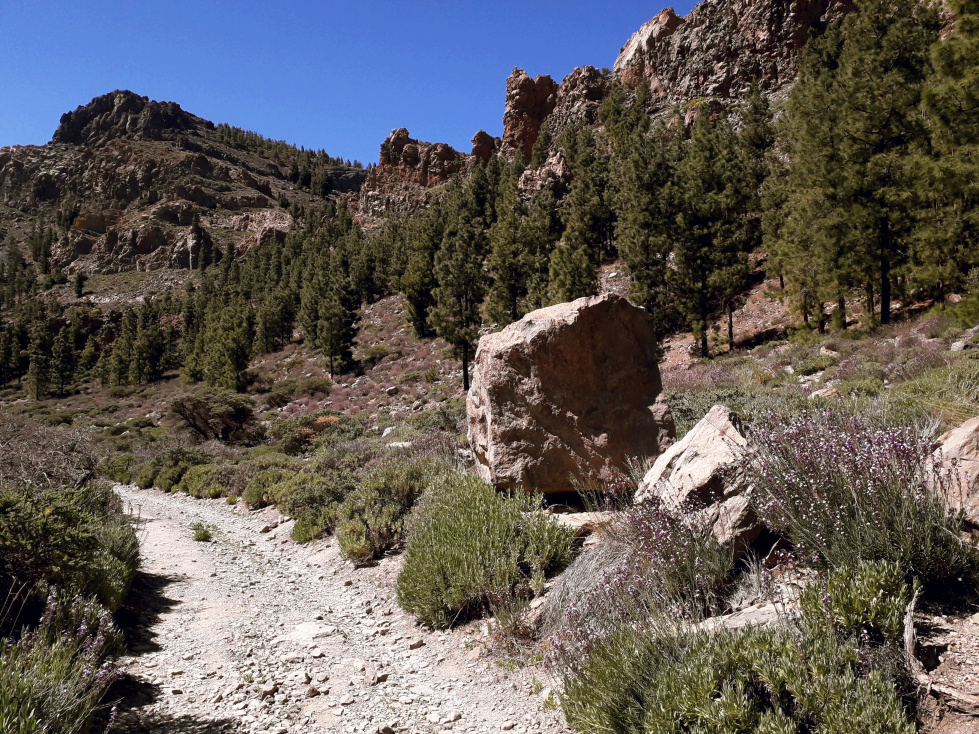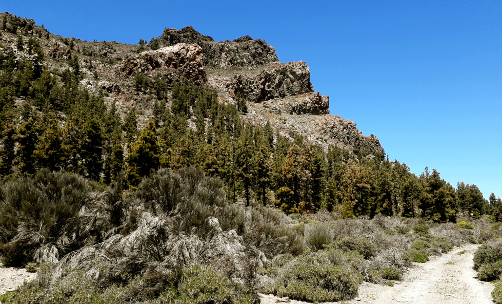 Etwa 50m nachdem die Absperrung endet liegt rechts am Weg ein großer Felsbrocken. Direkt dahinter beginnt der Einstieg zum Aufstieg, er ist nicht markiert. Der Pfad ist jedoch gut zu finden und steigt langsam am Hang hinauf. Nur weiter oben ist er etwas undeutlicher, und gelegentlich erfordert es auch etwas Kletterei, um bis hinauf zu den Felswänden zu kommen. Knapp 100 Höhenmeter weiter oben erreicht man einen Sattel. Ein guter Platz für eine Rast unter den Kiefern und für einen Blick hinüber zum Teide und zum Pico Viejo.