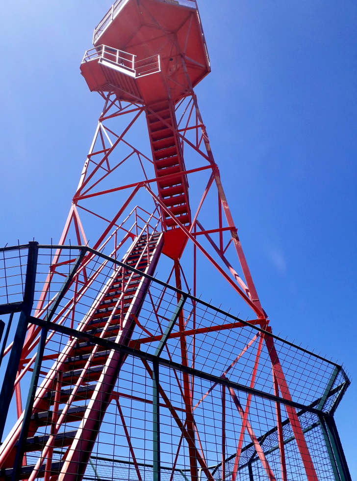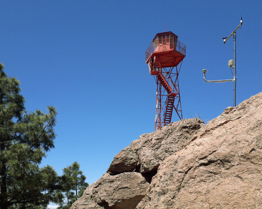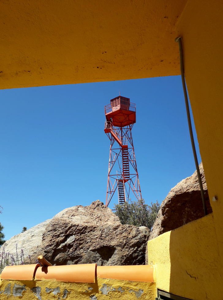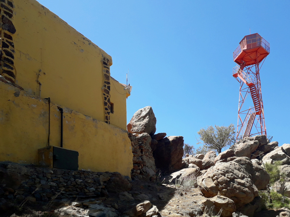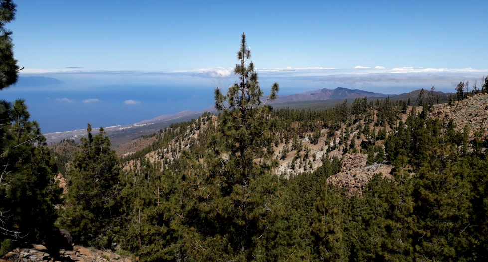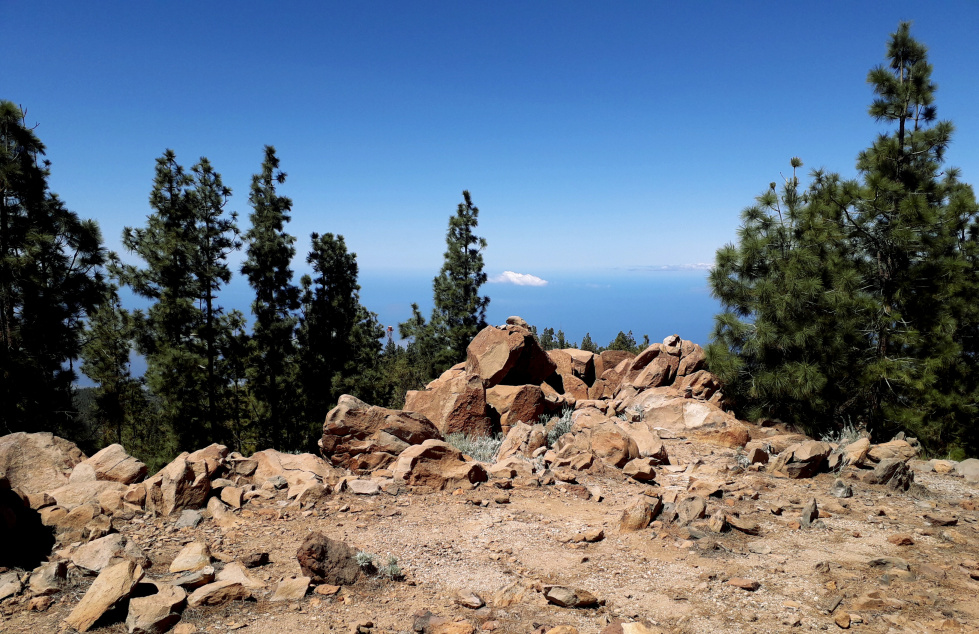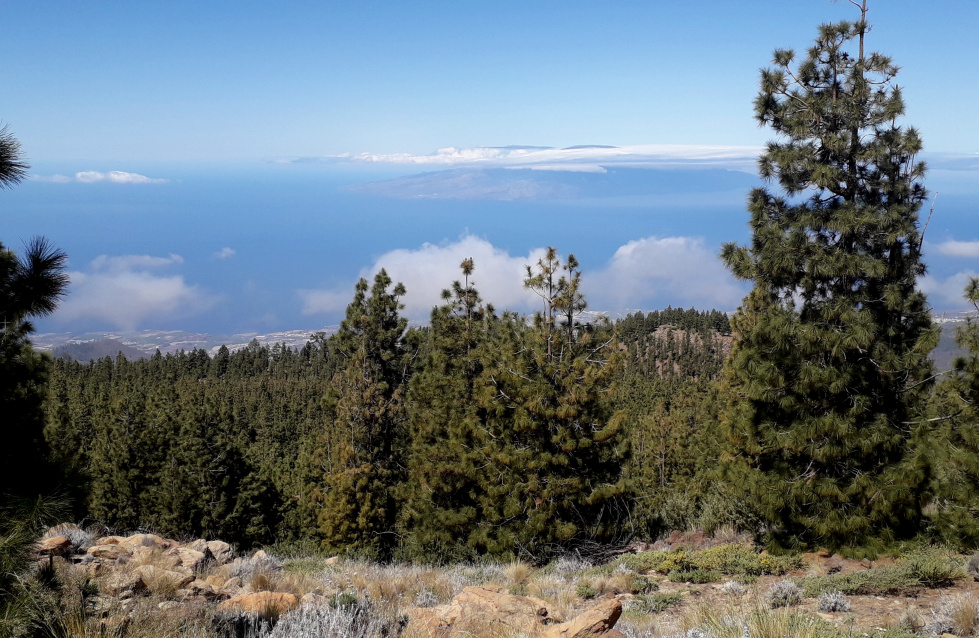 Der Weg ist nun einfach, aber stellenweise etwas zugewachsen, er verläuft immer am Hang entlang mit schönen Ausblicken nach Westen bis zum Teno-Gebirge. In der Ferne sieht man La Gomera und mit etwas Glück auch La Palma. Man kommt durch eine etwas weniger bewaldete Zone und bald darauf zu einer markanten Felsplatte, wo man nach rechts abwärts geht. Der Pfad ist immer wieder mit kleinen Steinmännchen markiert und führt zuerst steiler, dann etwas ebener bis zum Feuerwachtturm. Hier befindet sich ein perfekter Ausguck in alle Richtungen, ideal zur Überwachung von Waldbränden. Es gibt hier auch eine Wetterstation mit automatisch arbeitenden Messinstrumenten. Den Turm mit einer atemberaubenden Metallkonstruktion kann man nicht besteigen.