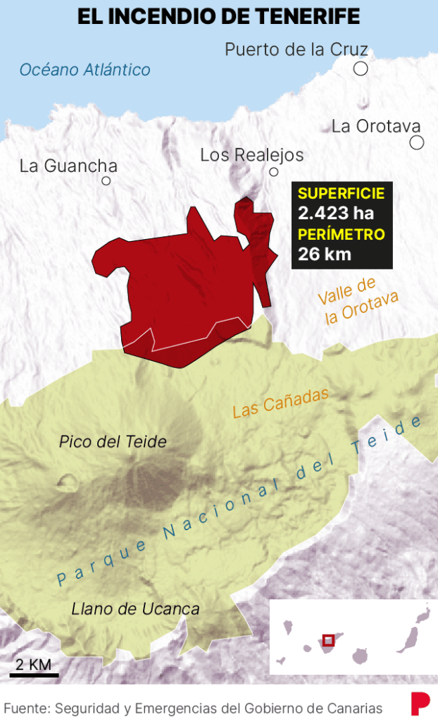 Im Juli 2022 traf es die Nordseite der Insel, wo 2700 ha verbrannten. Oberhalb von Los Realejos entstand im Wald ein Feuer, das sich auf Grund wechselnder Winde mit mehreren Fronten in alle Richtungen ausbreitete. Es erreichte die Grenze des Nationalparks unterhalb der Fortaleza und kam im Westen bis nach Icod de los Vinos. Besonders kritisch war die Front im steilen Berghang von Tigaiga. Dort ist es so steil, dass die brennenden Bäume hinunter stürzen konnten und das Feuer so bergab wanderte. Löschflugzeuge können dort nicht eingesetzt werden und Bodentruppen können keine Schneise schlagen. Mehrere hundert Menschen mussten aus den Häusern unterhalb des Brands evakuiert werden. Eine Woche lang flogen unermüdlich zwei Flugzeuge und elf Hubschrauber in das Chaos aus Rauch und Flammen, die 60m Höhe erreichten.