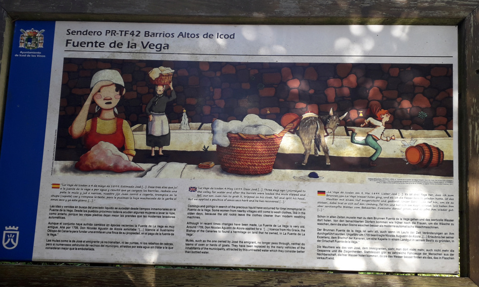 An dieser Quelle holen auch heute noch die Menschen der Gegend ihr Trinkwasser. Es ist allemal besser als das was aus der Leitung kommt. Und es ist gratis. Man braucht nur etwas Geduld, bis der Kanister oder die Plastikflasche voll ist. Seit dem 18. Jahrhundert ist die „Fuente de la Vega“ bekannt. Daneben befindet sich ein alter Waschplatz. Ob heute noch die Frauen – so wie es auf dem Schild steht – hierher zum Waschen kommen, weil es mit den Steinen besser geht als mit der Waschmaschine, ist aber zweifelhaft.