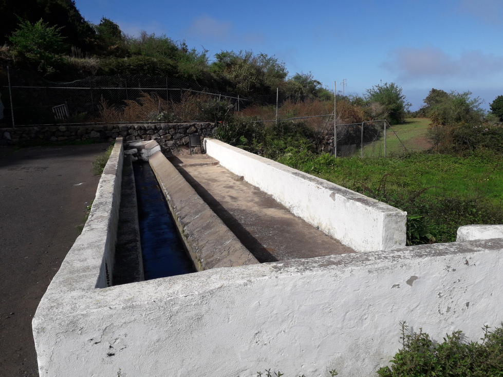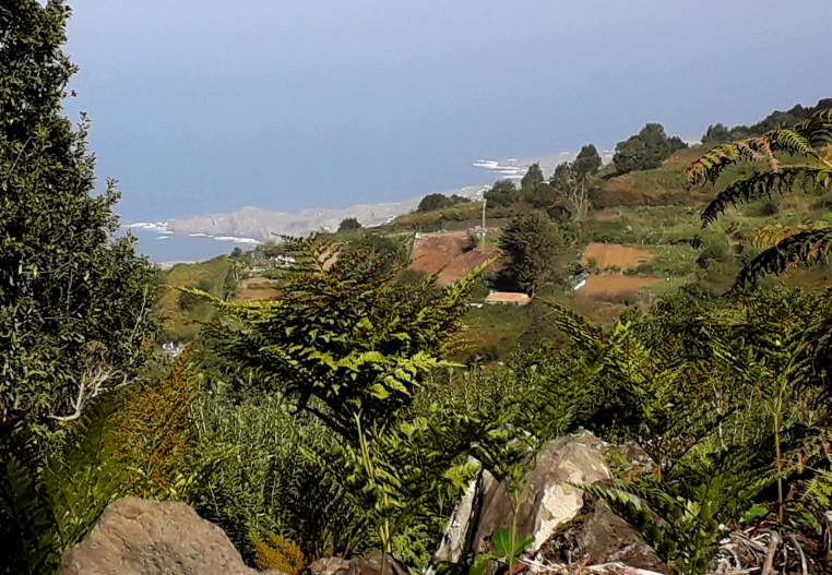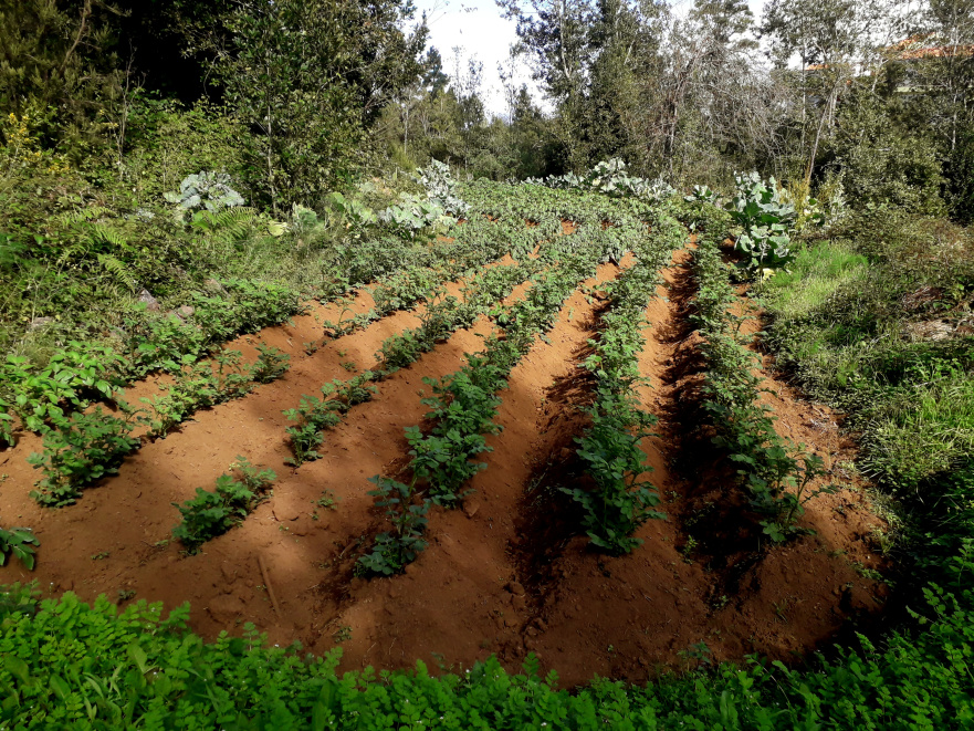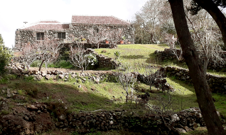 Grün ist es hier zwischen den Gärten, gut gepflegten Kartoffelfeldern und einigen Kiefern. Man befindet sich am Fuß des Cerro Gordo, an dem die vielen Terrassenfelder davon zeugen, dass die Landwirtschaft hier früher noch viel intensiver betrieben wurde. Vielleicht lohnt sich ein Blick zurück, denn bei klarem Wetter grüßt in der Ferne der Teide. Man sieht rechts den Pico Sur und links den Pico de las Cabras und sogar die Kante der Fortaleza.