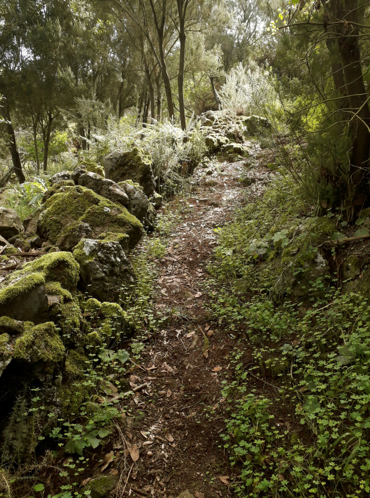 Für die Rundwanderung geht man vom Brunnen nach unten und um die Kurve, gleich danach geht ein betonierter Weg nach rechts oben. Hinter dem letzten Haus geht man nach links und dann geradeaus zwischen den Terrassenfeldern an einer Mauer entlang. Gleich danach befindet man sich auf einem wunderschönen Pfad im Wald, der langsam ansteigt, schattig und immer zwischen alten Mauern.