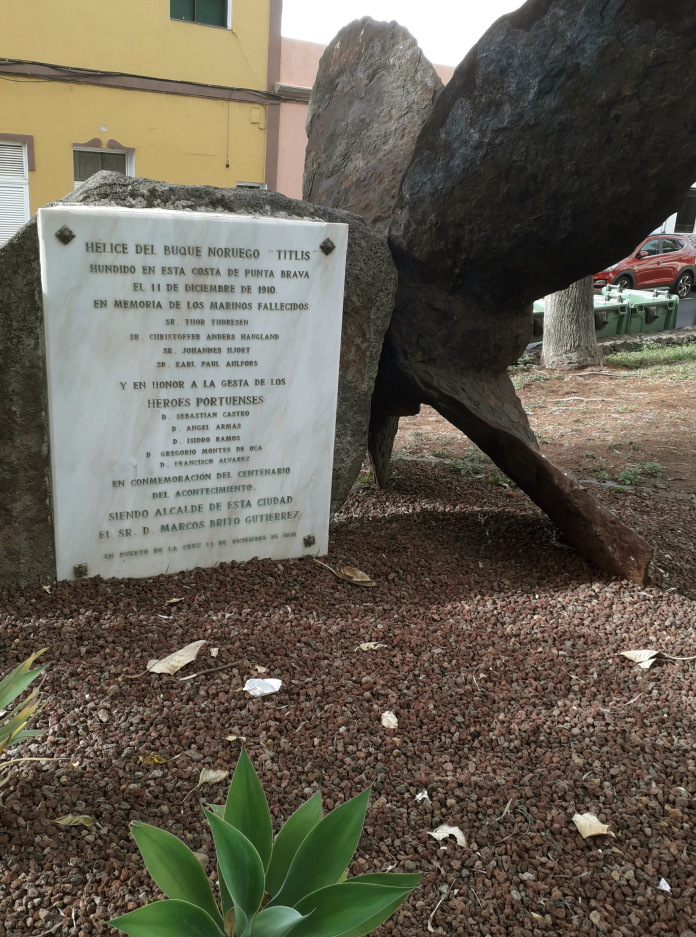 Am 25. Juni 1980 wurde die Schiffsschraube dem Stadtteil Punta Brava gespendet und gegenüber der Kirche Santa Rita auf einem einfachen Sockel aufgestellt, damit alle, Einheimische wie Auswärtige, nicht nur der Opfer des Schiffbruchs gedenken, sondern auch der tapferen Portuenser, die ihr Leben für andere riskierten. Hundert Jahre nach dem Unglück, am 11. Dezember 2010, wurde neben der Schiffsschraube auch eine Gedenktafel angebracht.