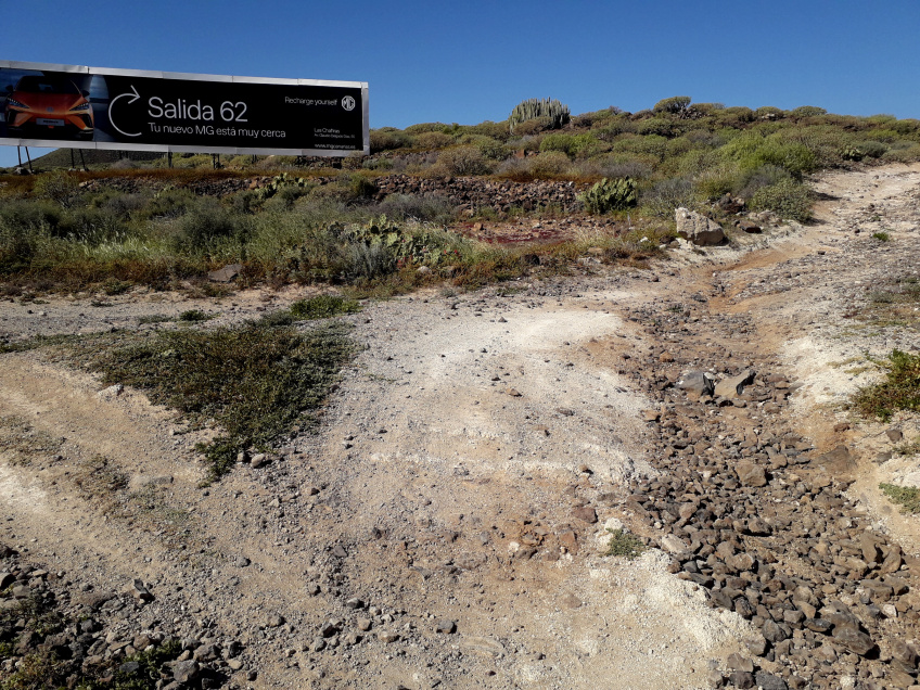 Dort sieht man eine große Werbetafel, zu der es mehrere Wege gibt. Direkt vor der Werbetafel geht eine Schotterpiste nach oben und hinter der Tafel nach links vorbei. Etwa 250m weiter verlässt man die Piste nach links und geht weglos auf eine Ruine zu, die man gut erkennen kann. Es ist die in der Wanderung 8 beschrieben Casa Bartolo. Von dort folgt man der Route über die Montaña Ifara und dem Dreschplatz Era de la Punta.