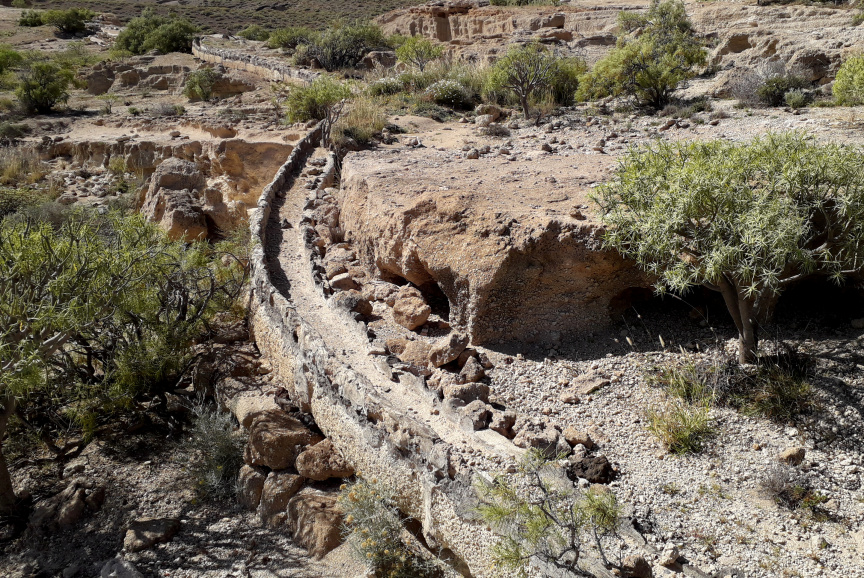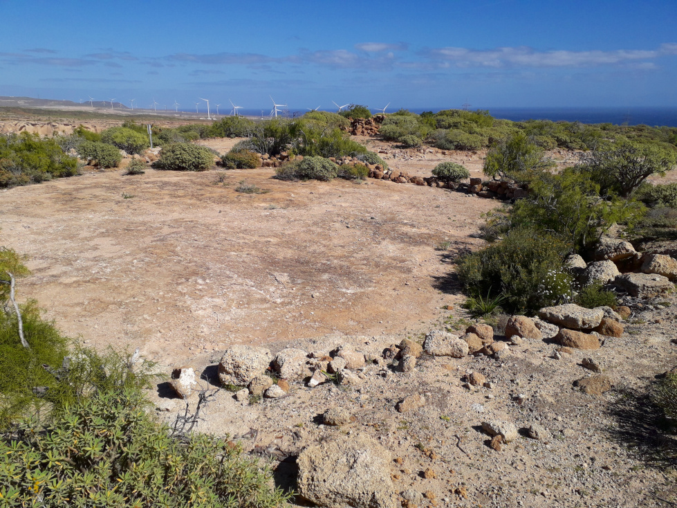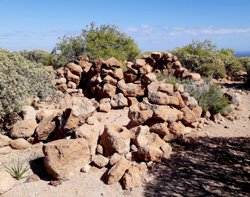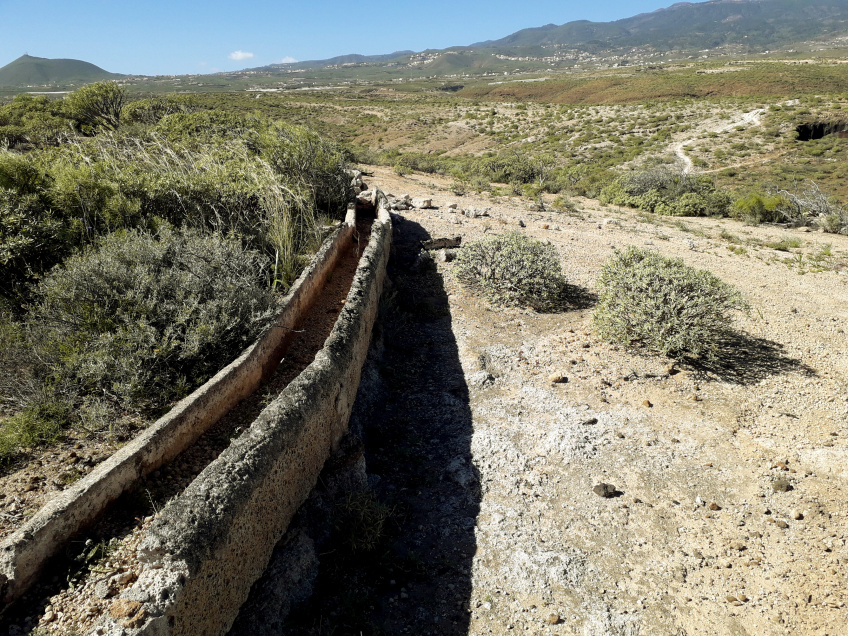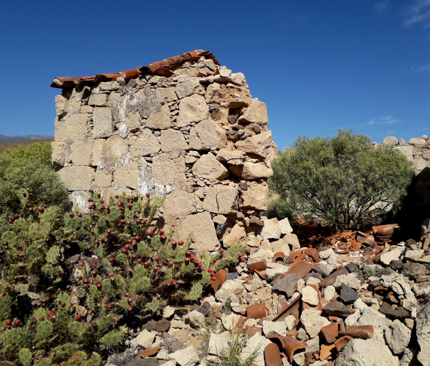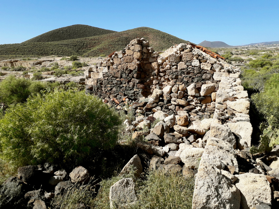 Es war die Wohnstätte der Familie Bartolo. Offenbar hat hier im Niemandsland früher doch jemand gewohnt und gearbeitet. Denn hinter den Ruinen entdeckt man einen alten Wasserkanal aus Jable-Gestein und ein paar Meter weiter einen großen Dreschplatz. Das bedeutet, dass hier früher einmal Getreide angebaut wurde und eine Familie davon leben konnte. Ganz erstaunlich!