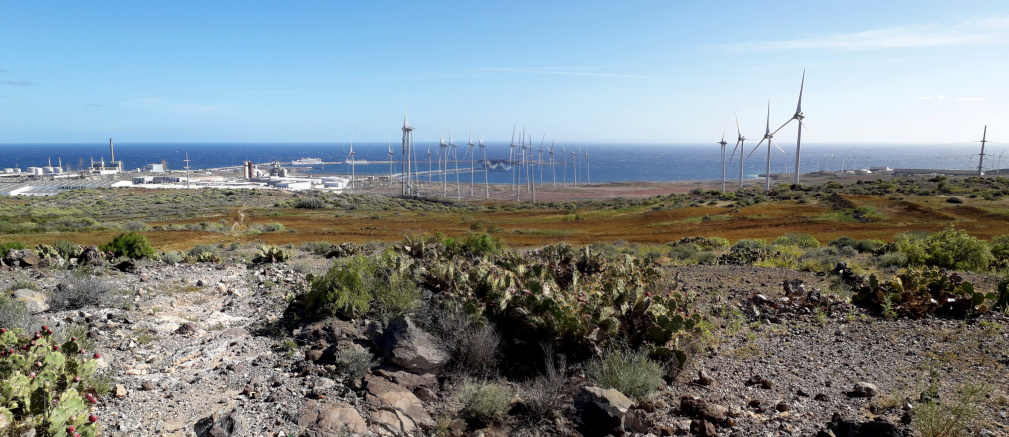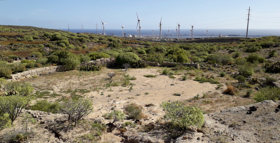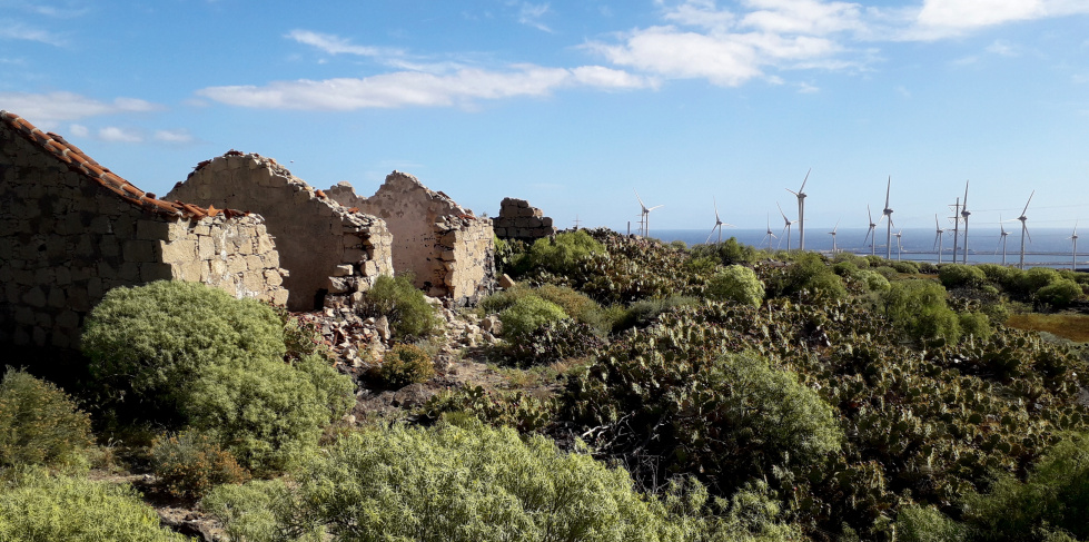 Unterhalb der beschriebenen Jable-Felsen geht man aber dann geradeaus weiter auf der Piste Richtung Autobahn, immer mit Blick auf die Windräder und den Hafen von Granadilla. Man kommt noch einmal an einer Ruine vorbei und geht dann in mehreren Kurven wieder hinunter zur Autobahnanschlussstelle.