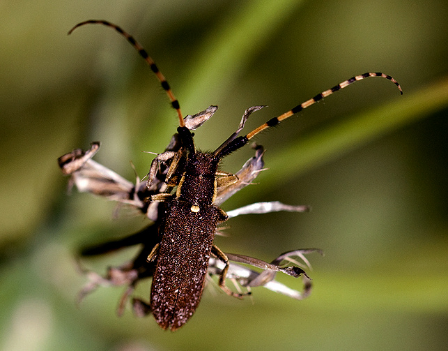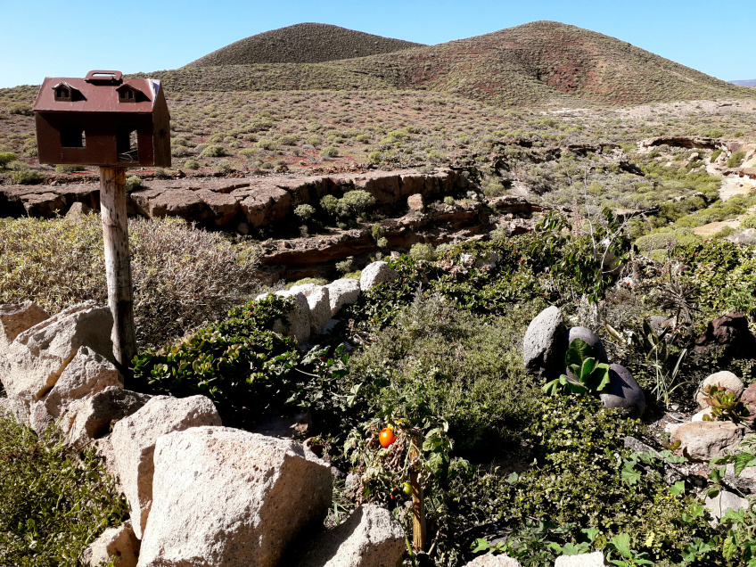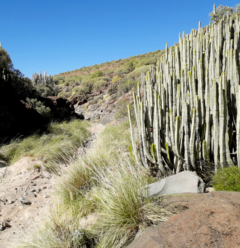 So ganz ausgestorben ist diese Landschaft aber nicht. Wer dort unterwegs ist, sieht vielleicht einige Vögel, den winzigen Kanarenpieper, die Brillengrasmücke oder den Gimpel (Dompfaff) mit seinem leuchtend roten Bauch. Und wer zwischen die Felsen schaut, sieht nicht nur die üblichen Eidechsen, sondern möglicherweise einen Käfer, dessen Antennen länger sind als sein Körper. Er kommt nur dort vor und heißt Agapanthia annularis. Man muss aber schon genau hinschauen, denn er ist nur 10 mm groß. Die Wüste lebt, auch wenn man es nicht gleich sieht.
