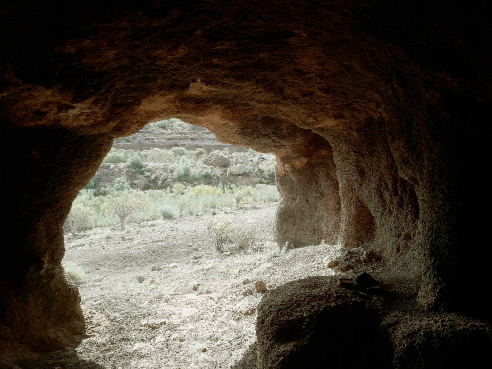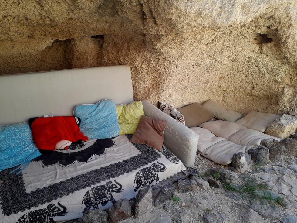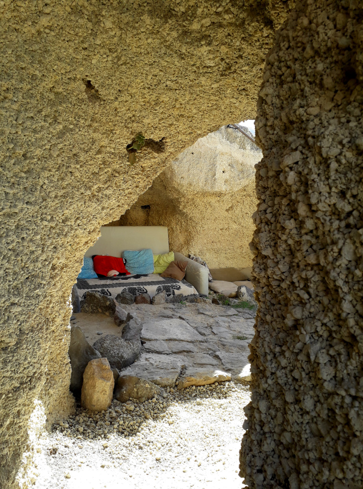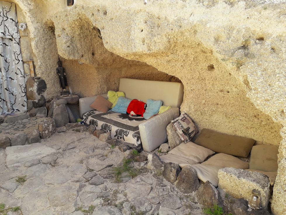 Nach dem Dreschplatz bleibt man auf der Piste und entdeckt hinter der nächsten Kurve schon wieder eine Überraschung. Hier scheint tatsächlich noch jemand zu wohnen. Mehrere der in die Felsen gehauenen Höhlen sind offenbar zu einer kuscheligen Wohnstätte ausgebaut worden. Es gibt eine Küche, ein Wohnzimmer und unter den überhängenden Felsen Sessel und Sofas mit Kissen. Hier hat es sich jemand richtig gemütlich gemacht. Ob es ein Hauptwohnsitz ist oder nur ein versteckter Rückzugsort für‘s Wochenende, bleibt fraglich.