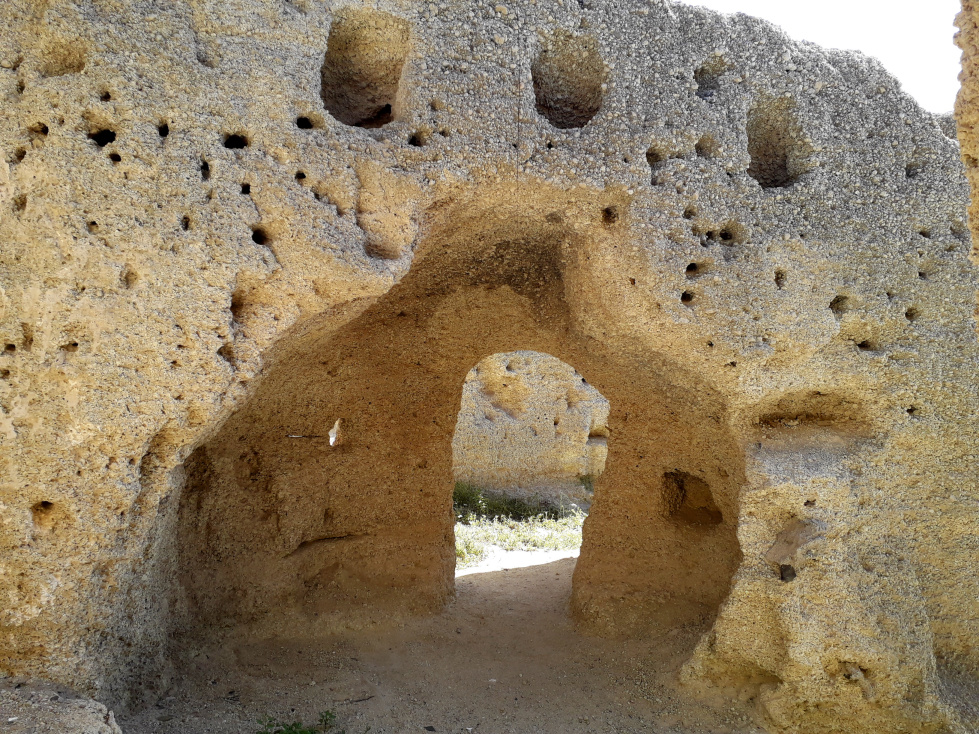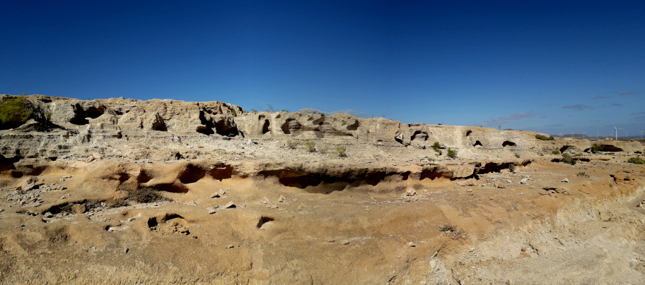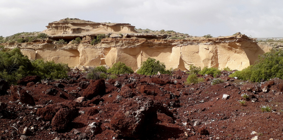 Jetzt bleibt man auf der blendend weißen Piste und kommt nach 200 m an einer Stelle vorbei, wo man die magischen Formen des Jable bewundern kann. Hier hat die Erosion bizarre Löcher in die Felsen gezaubert. Der Jable besteht aus verfestigten Aschen und Lapilli eines pyroklastischen Vulkanausbruchs und ist sehr typisch für den Süden der Insel. Das Gestein ist leicht zu bearbeiten und wird an mehreren Stellen abgebaut. Man kann Bausteine daraus machen, für Mauern, einfache Hütten oder Kanäle, aber es ist nicht standfest genug, um mehrstöckige Häuser damit zu bauen. Und man kann hervorragend Höhlen in den Fels schlagen, für Speicherräume, Ziegenställe – oder für kuschelige Wochenend„häuschen“.