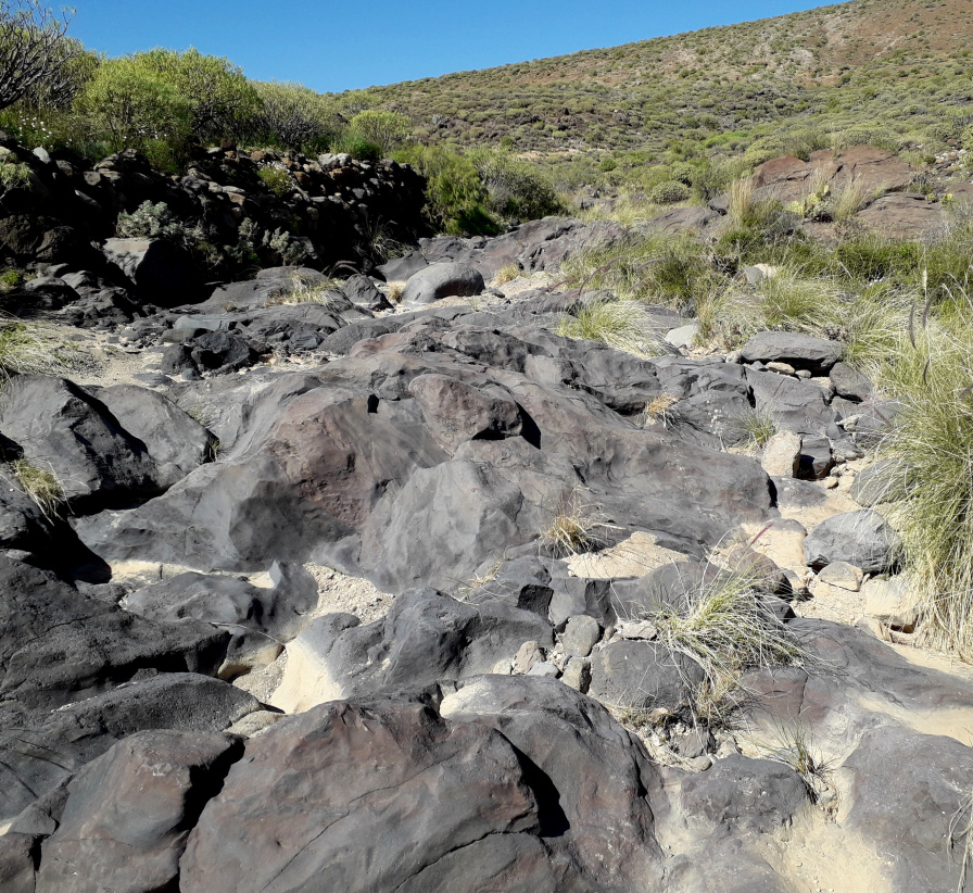 Der Weg überquert dann das Bachbett. In der Rechtskurve danach geht man geradeaus weiter, bleibt zunächst oberhalb des Bachlaufs und schlägt sich dann durch die Büsche hinunter ins Bachbett. Diesem folgt man nun weiter, immer über die schwarz-blauen, ausgewaschenen Felsen und durch ebene Sandflächen. Möglicherweise steht irgendwo zwischen den Felsen auch noch eine Pfütze mit Wasser.