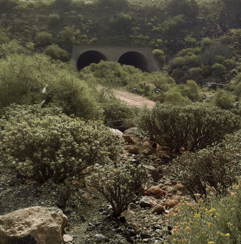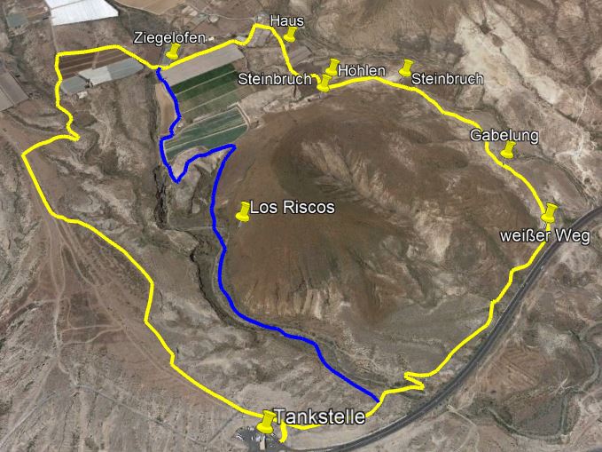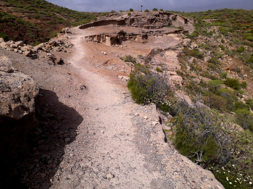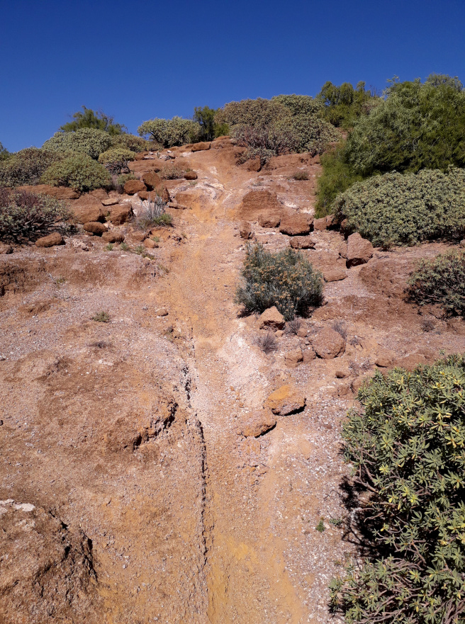 Kurz nach dem Ziegelofen geht man nach links an den Feldern entlang. Nach 550m biegt man auf einer Landspitze scharf nach links ab und nähert sich dem steilen Abhang der Montaña de los Riscos. Dort gibt es einen Wanderpfad, der in den Barranco hinunter führt. Nun folgt man immer dem Talgrund, bis eine deutliche Piste nach rechts aus dem Tal heraus führt.