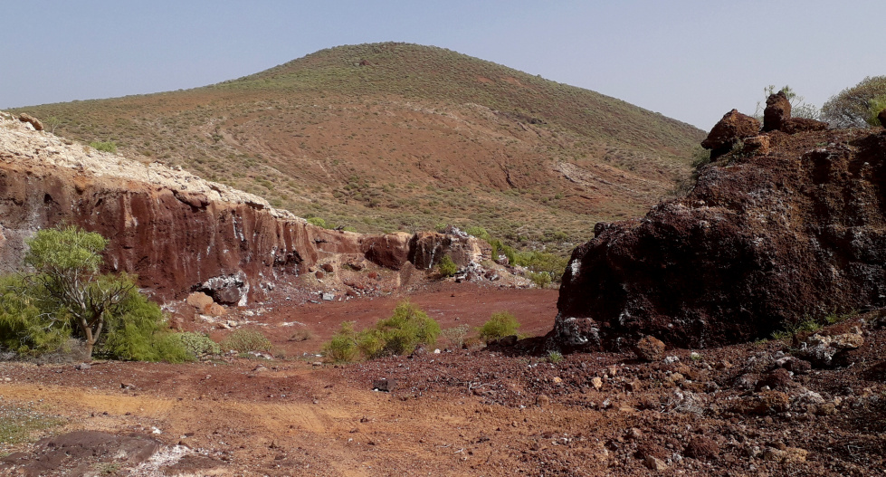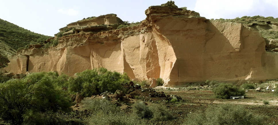 Links, am Fuße der Montaña de los Riscos, liegt auch ein nicht mehr genutzter Steinbruch, und das rotbraune Abraummaterial bildet einen farblichen Kontrast zu den blendend weißen Felswänden gegenüber.