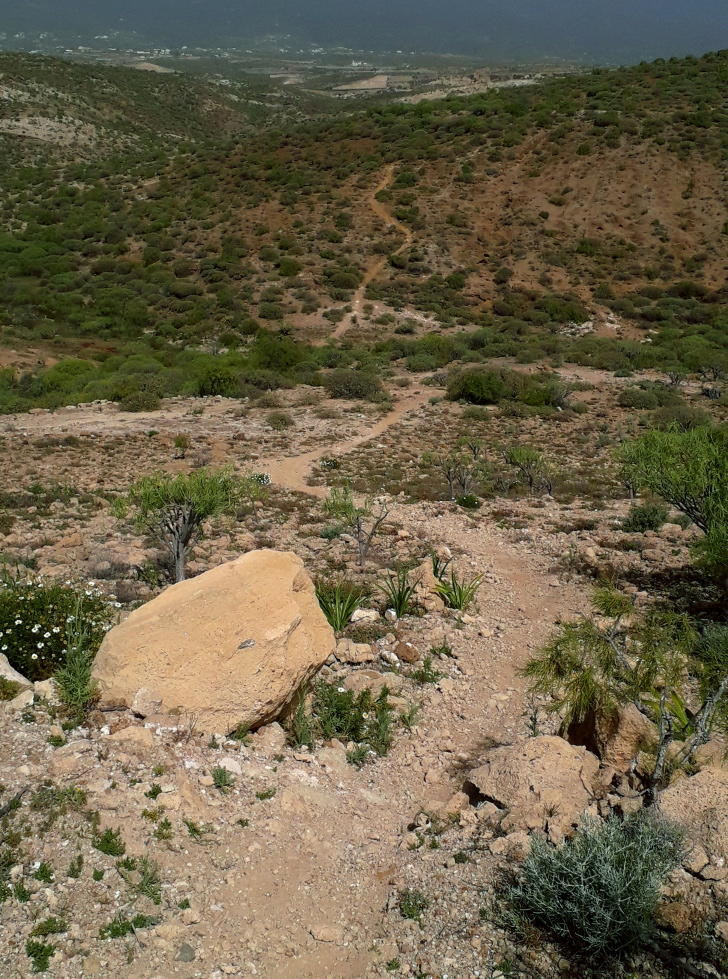 300m weiter zweigt rechtwinklig nach links eine Piste ab, auf der man nun immer in südwestlicher Richtung am Fuß des Berges entlang geht. Es ist ein staubiger, trockener Weg, aber die zahlreichen verlassenen Ackerterrassen zeigen, dass auch hier einmal Bauern ihren Lebensunterhalt gesucht haben. Nicht zu übersehen ist nach 1,3 km links des Wegs die Ruine eines ehemaligen Bauernhauses.