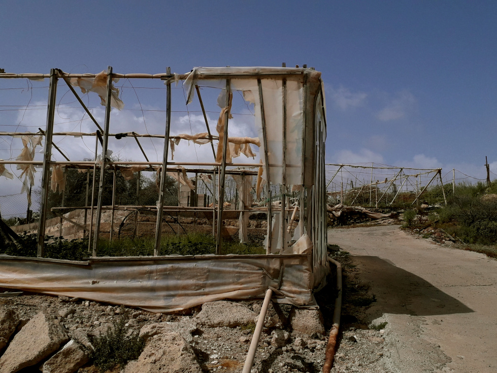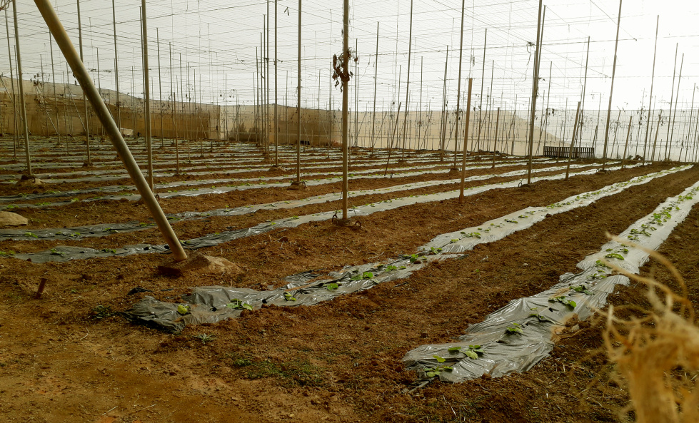 Danach geht man, vorbei an überdachten Feldern, hinauf zu einem offenbar verlassenen Haus und weiter zu verlassenen Feldern. Nach einem kürzeren steilen Stück biegt man beim Wasserbecken scharf links ab. Der Weg ist mit einer Kette versperrt, die man aber gefahrlos übersteigen kann. Nun kommt man zwischen Gewächshäusern nach und nach aus dem Niemandsland heraus. Fast 200 m lang geht es dann geradeaus an einem solchen Gewächshaus entlang.