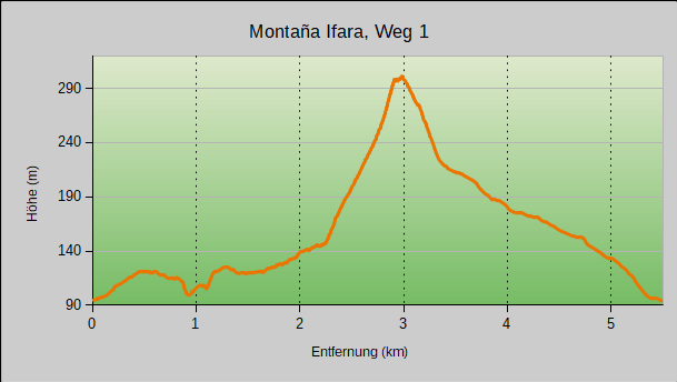 In einem weiten Linksbogen folgt man immer dem Bach, bis man geradeaus auf dem gegenüber liegenden Hang die Mauern einer Finca sieht. Rechts ist der Abhang der Montaña Ifara, und dort beginnt auch der Aufstieg. Der Aufstiegsweg ist gut zu erkennen und am Anfang leicht zu gehen. Erst im oberen Teil wird er doch erstaunlich steil, und die lockeren Steinchen machen das Steigen sehr unbequem.