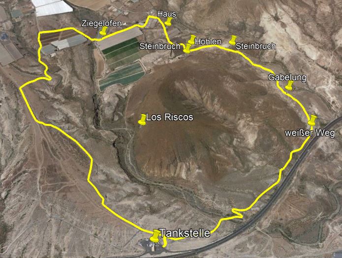 Karte für die große Wanderung in der 8, grün, Tankstelle – weißer Weg – Gabelung – Montaña Ifara – Ruinen – Höhlenwohnungen – weißer Weg – Steinbruch – Ziegelofen – Tankstelle: