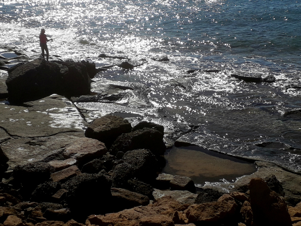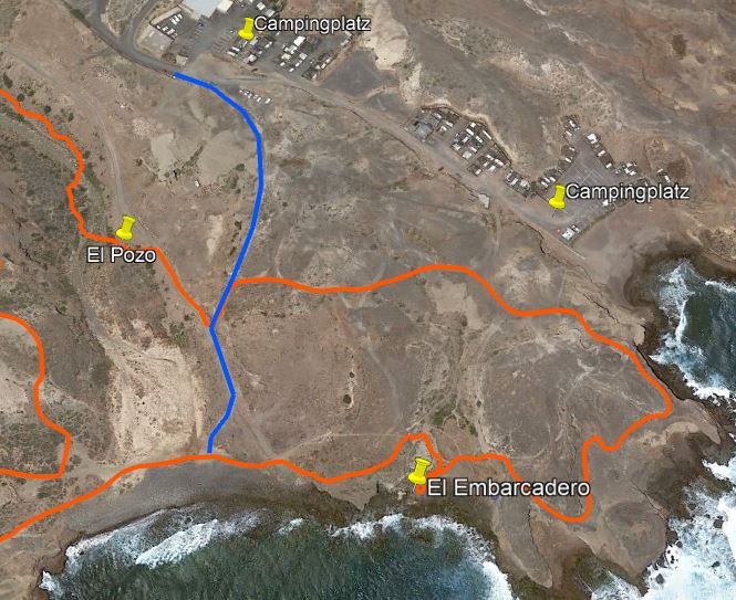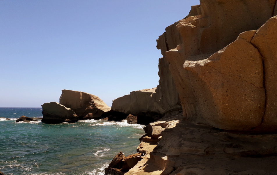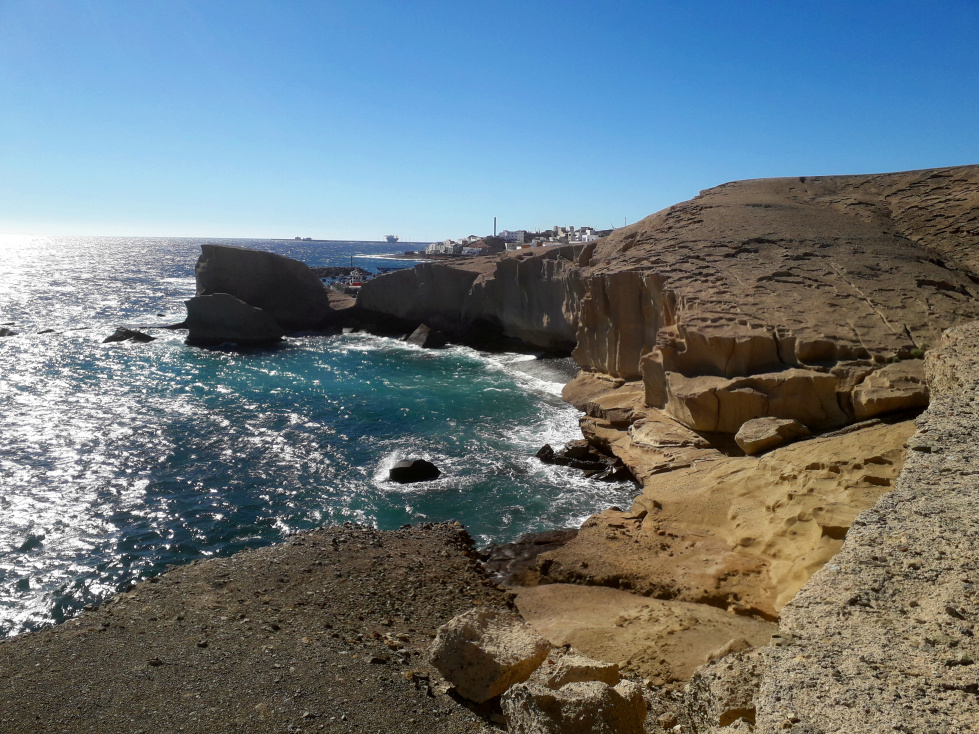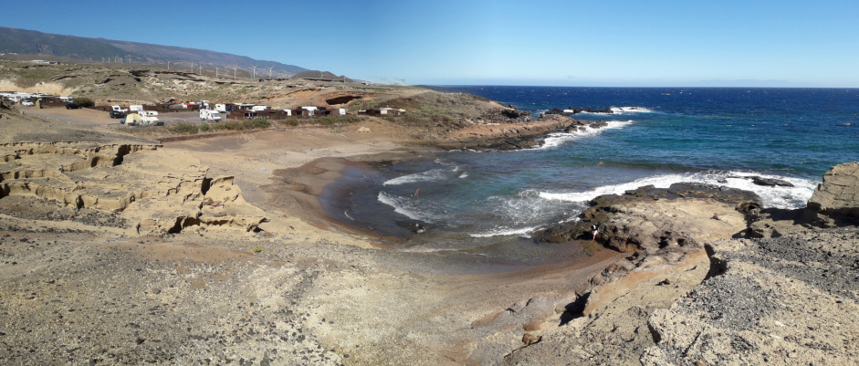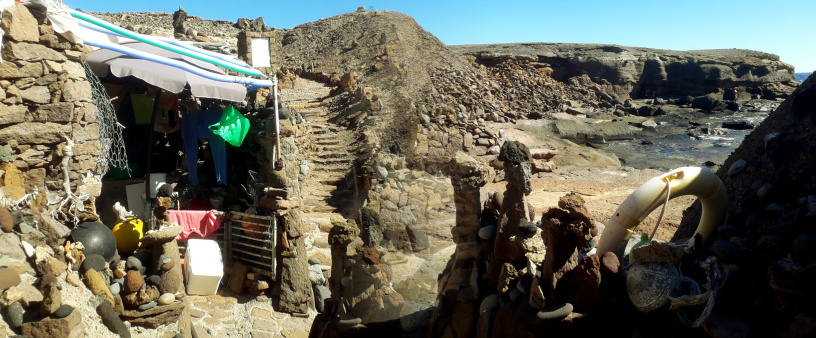 Man könnte wieder zurück gehen zum Strand, oder aber die nächste kleine Halbinsel umrunden, wo es noch weitere bizarre Felsformationen zu bestaunen gibt. Oberhalb der nächsten Bucht, der Caleta del Sordo, liegt der Campingplatz von La Jaca mit Wohnmobilen und einigen Dauercampern, die sich einfache Holzhütten gebaut haben. Aber es ist ein trockener, sonniger und windiger Ort, den man mögen muss.