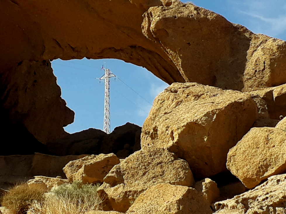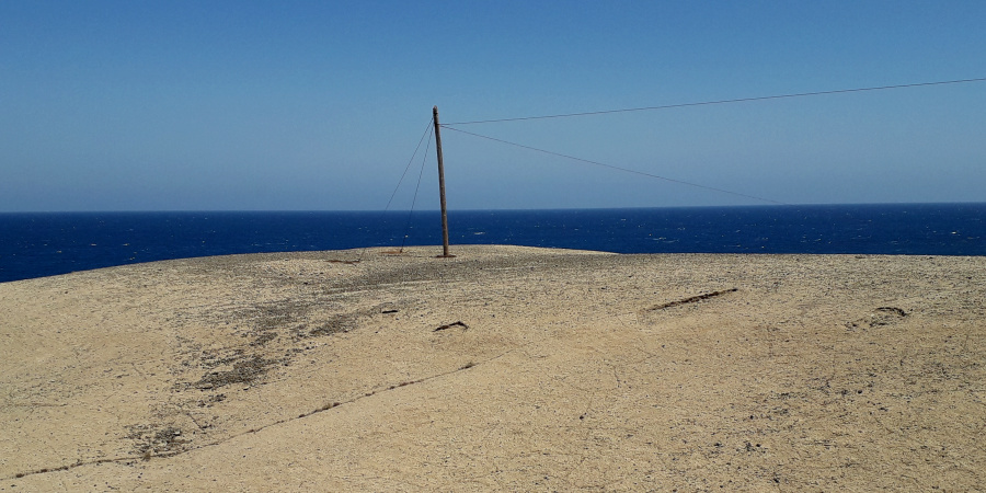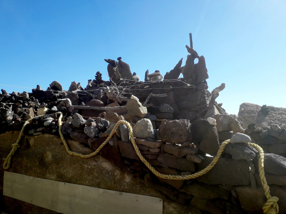 Genau links davon könnte man (falls nicht abgesperrt) den steilen Hang hinauf steigen. Es ist einfacher, als es zunächst aussieht, denn die Oberfläche ist hart und alle kleinen Steinchen wurden längst vom Wind weggeweht. Man geht am bestem im Zickzack, und mit einiger Vorsicht kommt man bis zur höchsten Stelle der Bergrückens, wo ein ehemaliger Strommast steht. Eine weitere Warnung: Hier kann es richtig heftige Windböen geben!