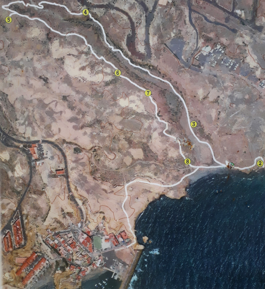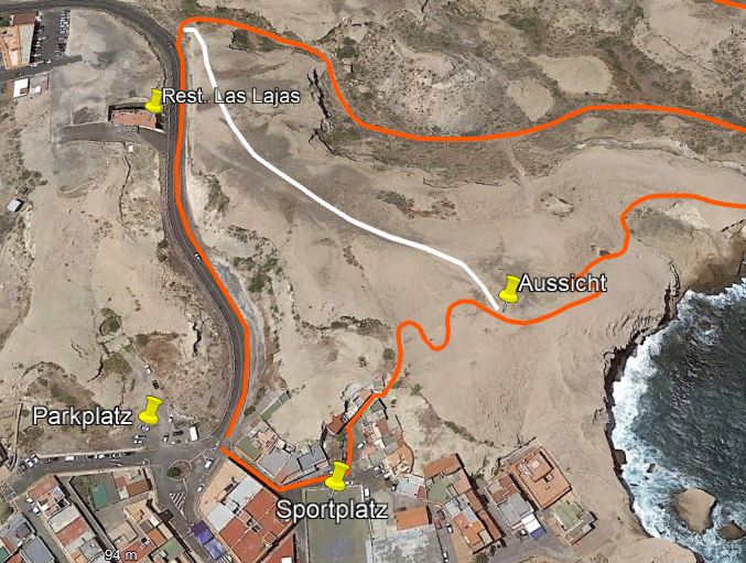 Bitte beachten: Es gibt bei dieser Runde einige weglose Stellen und ein paar Kletterpassagen, bei denen Vorsicht und Trittsicherheit erforderlich ist. Falls der Aufstieg am Anfang gesperrt ist oder zu gefährlich erscheint, nimmt man den beschriebenen Weg vom Sportplatz zwischen den Häusern hindurch. Wer gar nicht klettern will, findet einen einfachen Weg oberhalb des Restaurants Las Lajas und geht bequem auf dem Höhenrücken entlang bis zum Mast und zur Aussicht über die Küste. Wer sich den folgenden Abstieg nicht zutraut, geht am besten wieder zurück. Karte: weiß.