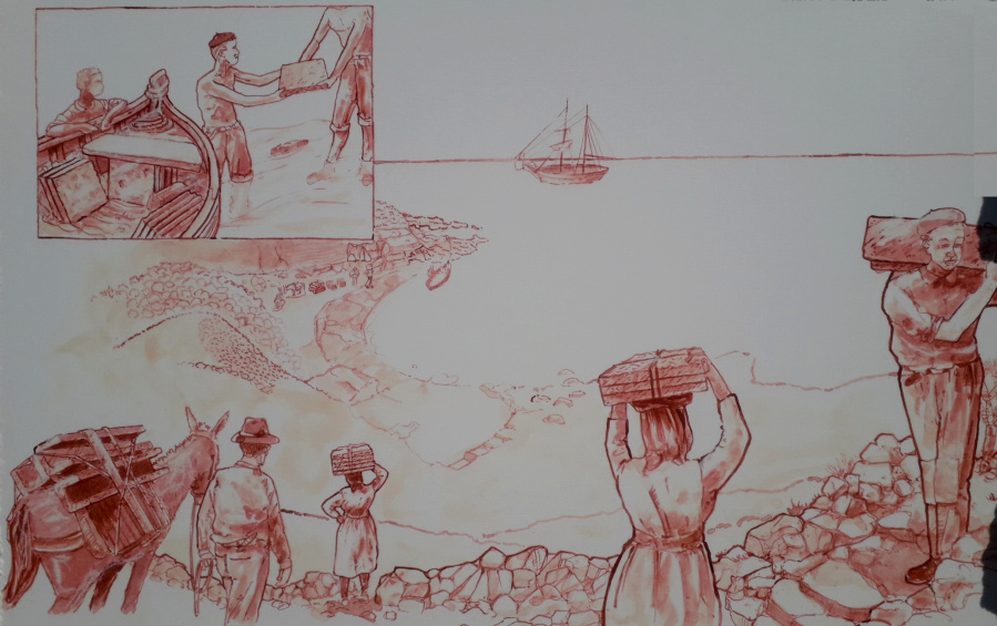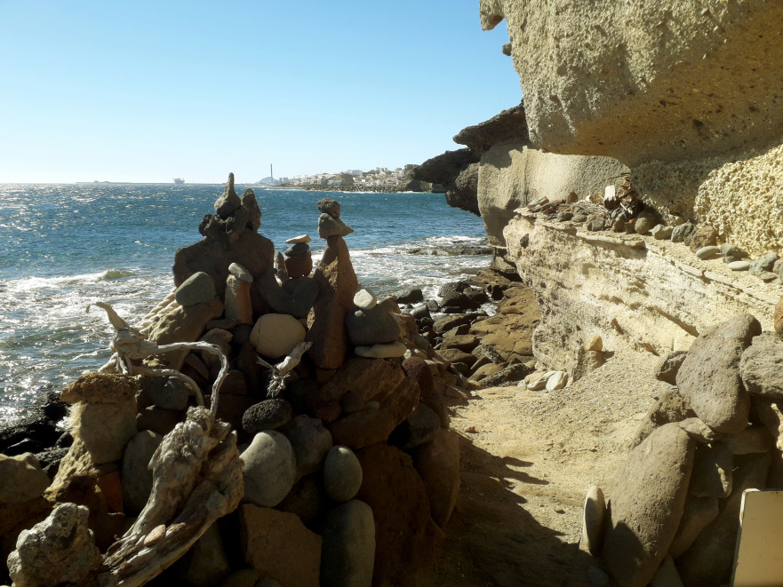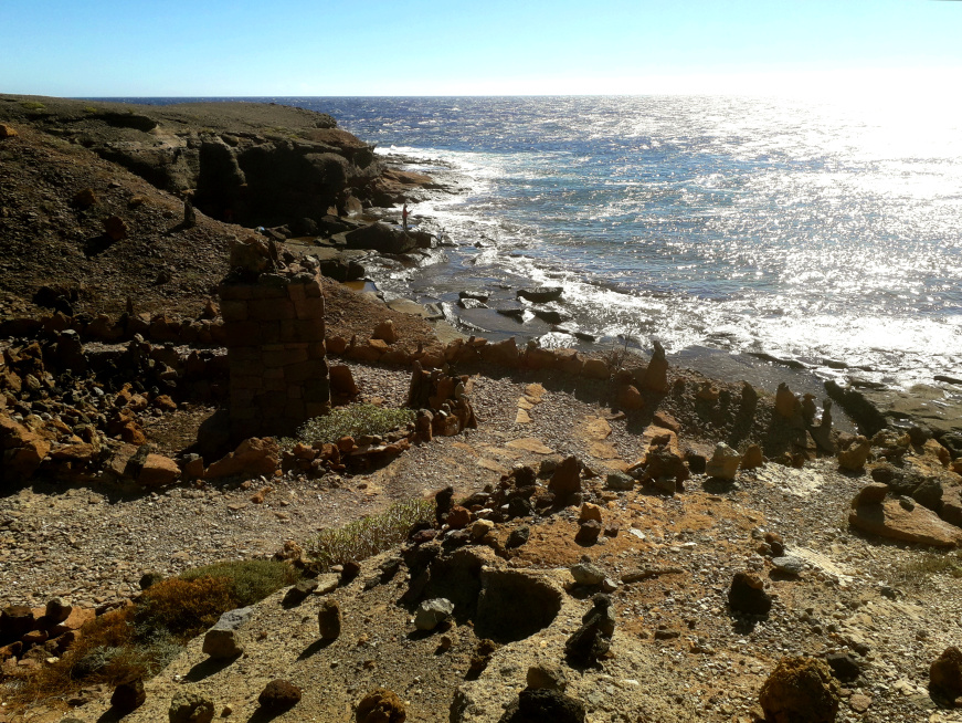Weiter geht es über die nächste kleine Anhöhe. Dahinter kommt man zu einem in früheren Zeiten bedeutenden Ort, El Embarcadero. Es war eine Anlegestelle, an der vor allem Steine verladen wurden, die weiter oben im Barranco Bijagua behauen wurden. Es konnten aber nur kleine Boote hier anlegen, die die Steine dann zu dem in der Bucht ankernden Schiff transportierten. Die Segelschiffe konnten 50 bis 150 Tonnen Steine laden. Es gab einen regen Handel mit den hier gefertigten Fliesen, Tränken, Waschsteinen oder Kanalelementen. Für die Schiffe war es auch ein wichtiger Ballast für die Rückfahrt über den Atlantik, nach Kuba, Venezuela oder Puerto Rico. Für viele der historischen Bauwerke in Havanna, Santo Domingo oder Cartagena waren die Steine aus Tajao ein unverzichtbares Baumaterial. An diesem heute ziemlich verlassenen Ort befand sich also bis zur Mitte des 19. Jahrhunderts ein beachtliches Industriezentrum mit hunderten von Beschäftigten.