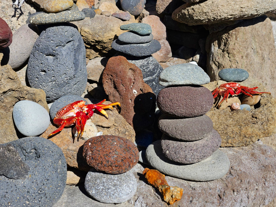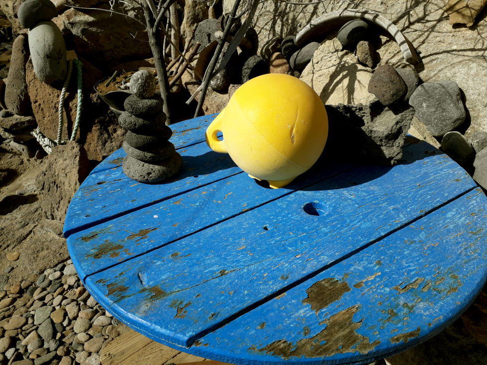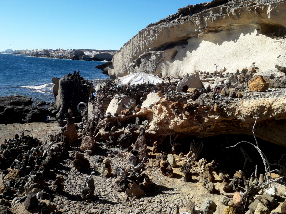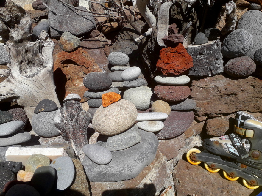 Versteckt unter einem Felsüberhang hat sich hier eine Familie eine witzige Ferienwohnung gebaut. Tausende von Steinen wurden zu kleinen Kunstwerken aufgetürmt. Ein Zeltdach dient als Schutz vor Wind und Sonne. Natürlich wird am Wochenende hier gekocht, und für die ganze Familie gibt es Tische und Bänke, geschmückt mit allerlei Kleinkram. Richtig gemütlich kann es dort sein.