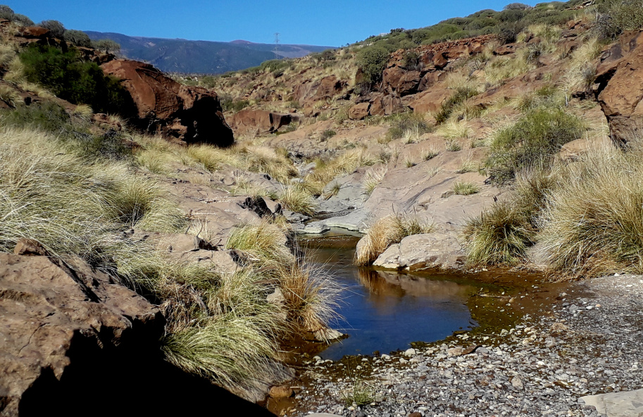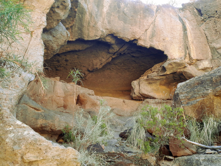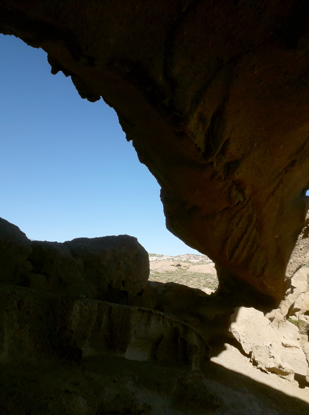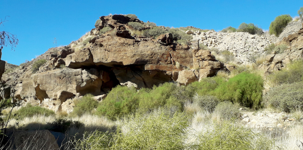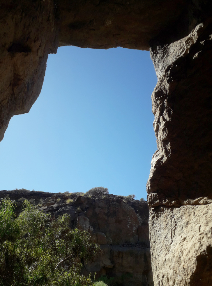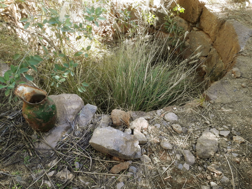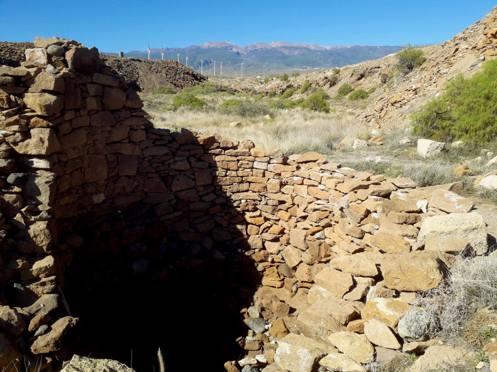 Der Rückweg geht dann nach links über die Höhe, weg vom Campingplatz und wieder hinunter zum Barranco Bijagua. Oberhalb des Talgrunds verläuft eine Schotterpiste, der man etwa 100 m folgt, bis man links unten den alten Brunnen erkennen kann. Es gibt einen steinigen Pfad, auf dem man die paar Meter hinunter klettern muss. El Pozo, der Brunnen, war ganz entscheidend für das Überleben in dieser trockenen Gegend, wo im Durchschnitt weniger als 150 mm Regen im Jahr fällt. Nach Regenfällen jedoch sickert das im Barranco fließende Wasser durch den sandigen Talgrund bis zu wasserundurchlässigen Schichten und staut sich dort. So grub man ein tiefes Loch in den Sand, und weil das Wasser so wertvoll war, sicherte man das Loch mit einer Mauer aus gut bearbeiteten Steinen. Die hohe Außenwand, die einmal mehr als zwei Meter maß, schützte den Brunnen vor Überschwemmungen und Sedimenten, die ihn zuschütten könnten. Im Innern gab es eine Treppe nach unten, um an das Wasser zu kommen und um den Brunnen zu reinigen.