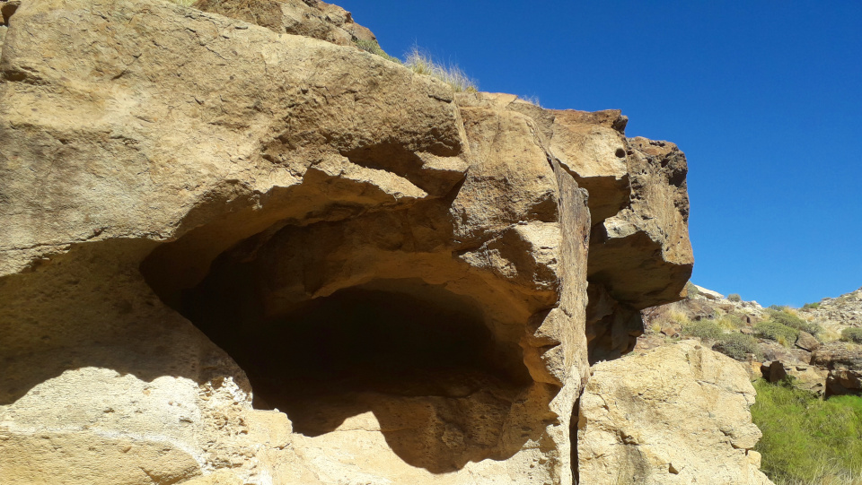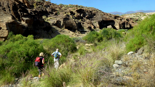Etwa 500 m bleibt man nun auf diesem Weg im Barranco, der langsam etwas schmaler wird. Dann kommt man zu einer Zone, wo sich rechts und links mehrere Höhlen in den Felsen befinden. Sie sind teilweise recht tief, aber schwer zu begehen. Auf jeden Fall sind die Felswände ein spannendes Landschaftselement und bieten auch etwas Schatten für eine kleine Rast. Man kann noch ein Stück dem Barranco folgen, aber dann gibt es eine steile Stelle, wo es nicht mehr weiter geht. Dort plätschert vielleicht sogar ein kleiner Wasserfall.