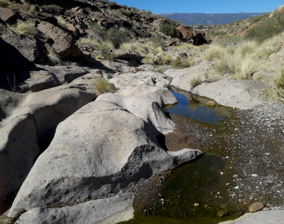 Oberhalb der Schlucht geht es nun ein Stück weiter, bis der Weg wieder hinunter in den Talgrund geht. Dort sind die Felsen glatt geschliffen. Dazwischen bilden sich immer wieder Tümpel und Becken mit stehendem oder sogar fließendem Wasser. Den Ausstieg aus dem Bachbett auf der gegenüberliegenden Seite muss man wieder einmal ein bisschen suchen, zunächst über die glatten Felsen, dann etwas steiler, aber deutlicher zu sehen. Oben hält man sich rechts auf einem mit Steinen eingefassten Pfad. Aber selbst wenn man diesen nicht findet, kommt man weiter oben automatisch zum absoluten Highlight dieser Wanderung.