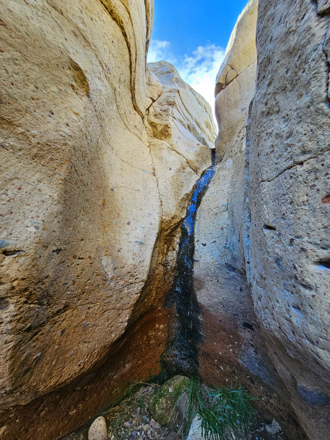 Dort steht auch wieder ein Steinquader (man sieht ihn schon von unten) mit einer Informationstafel, auf der man etwas mehr über die geologischen Hintergründe der hiesigen Gesteine erfährt. Es handelt sich hier um so genannte Ignimbrite. Das nach den Vulkanausbrüchen abgelagerte Asche-Stein-Gemisch wurde durch weitere „Feuerregen“, besonders heiße Glutwolken, wieder aufgeschmolzen, verbacken und verfestigt. So entstand ein sehr hartes und dichtes Gestein, das, im Gegensatz zu dem weißen Tuff, extrem schwer zu bearbeiten war, aber such als stabiles Baumaterial geschätzt wurde. Und trotzdem hat sich hier im Laufe der Jahrtausende eine Schlucht in das Gestein hinein gefressen.