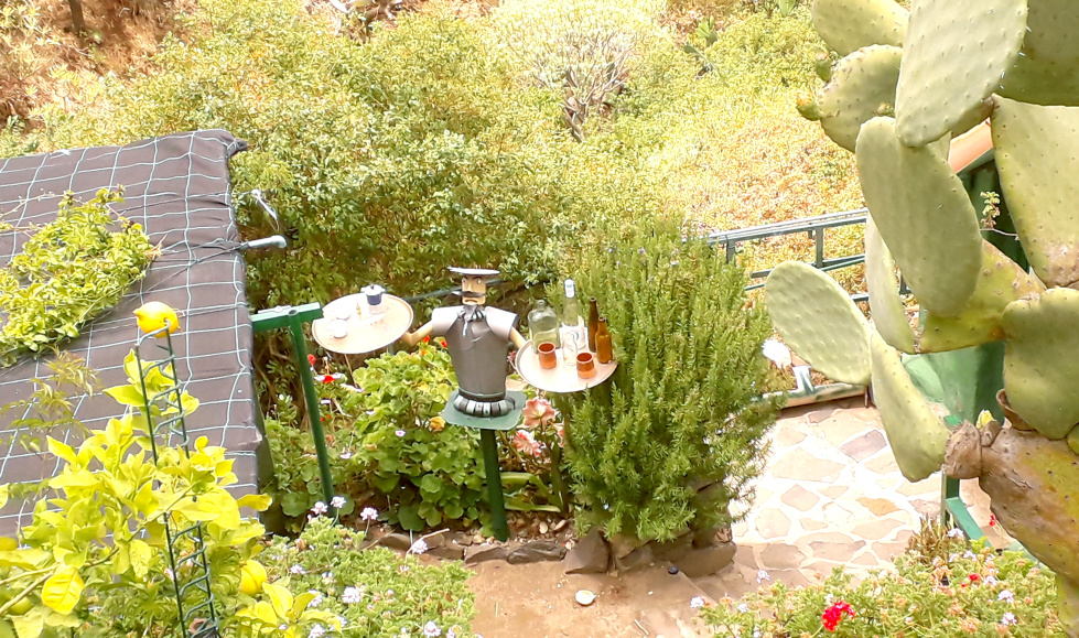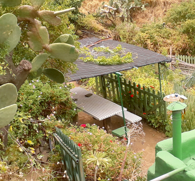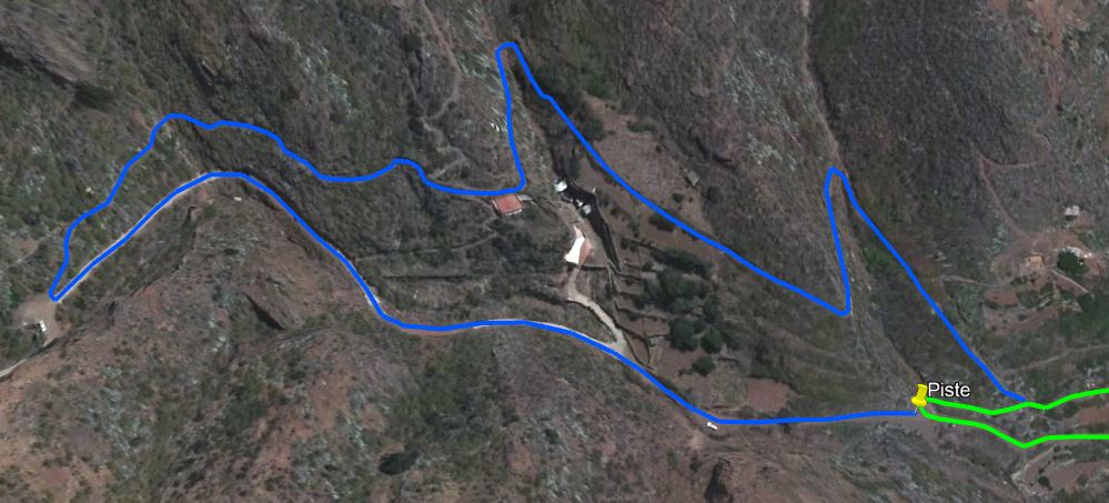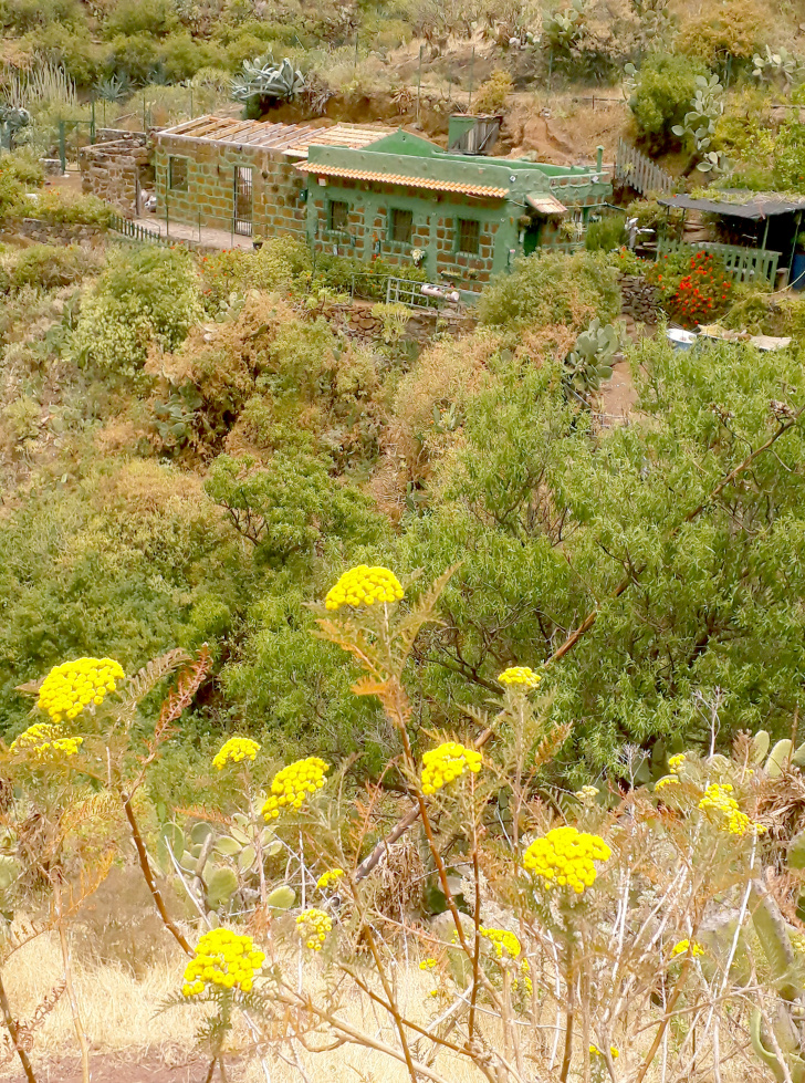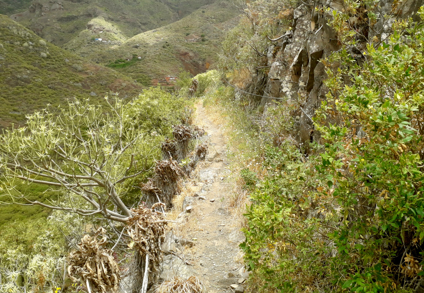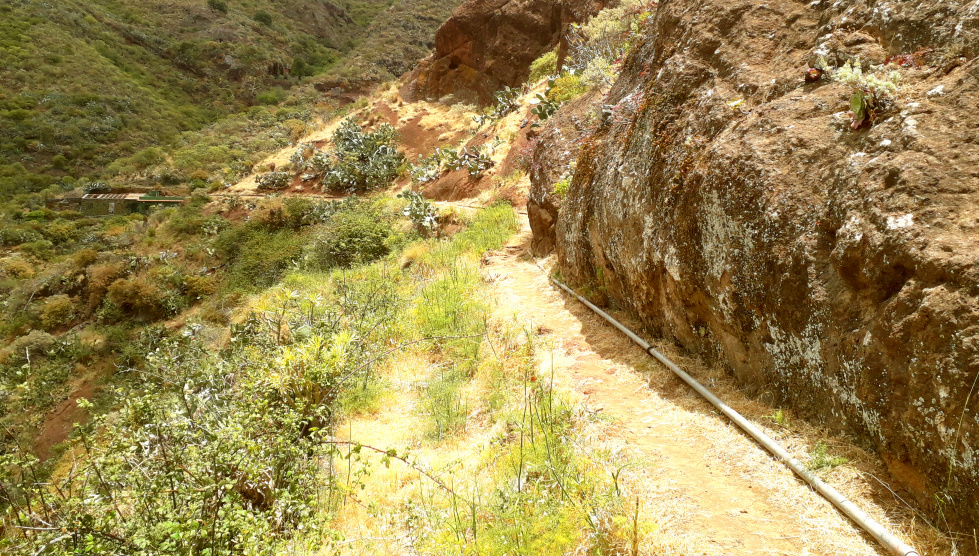 Dort wo der Kanalweg sich der Piste nähert, etwa 20 m vor der Holzbrücke, geht man nach rechts oben und kommt wieder auf einen Weg, der in ein Seitental hinein führt. An der ersten Rechtsbiegung geht man nach oben und kommt wiederum oberhalb von Häusern vorbei. Weiter geht es immer am Hang entlang, bis man nach insgesamt 750m automatisch wieder auf die Piste trifft. Sie ist übrigens die einzige Zufahrtsmöglichkeit zu diesen Ansiedlungen und kommt von ganz oben, aus dem Stadtteil Jardina von La Laguna. Zurück geht es auf dieser Piste wie oben beschrieben.