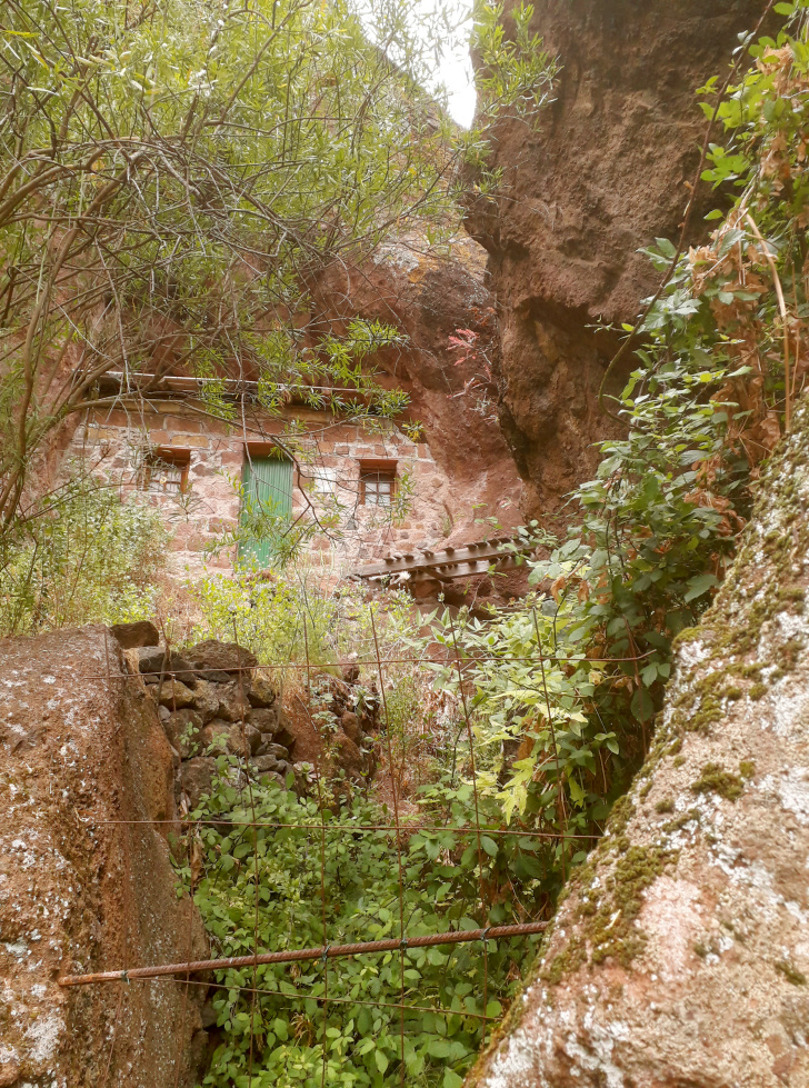 Dann wird es noch einmal spannend, denn man kommt unterhalb von gewaltigen roten Felswänden vorbei und einer unter den Felsen in die Wand hinein gebauten Hütte.