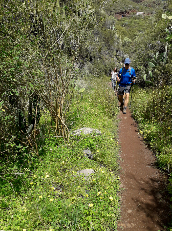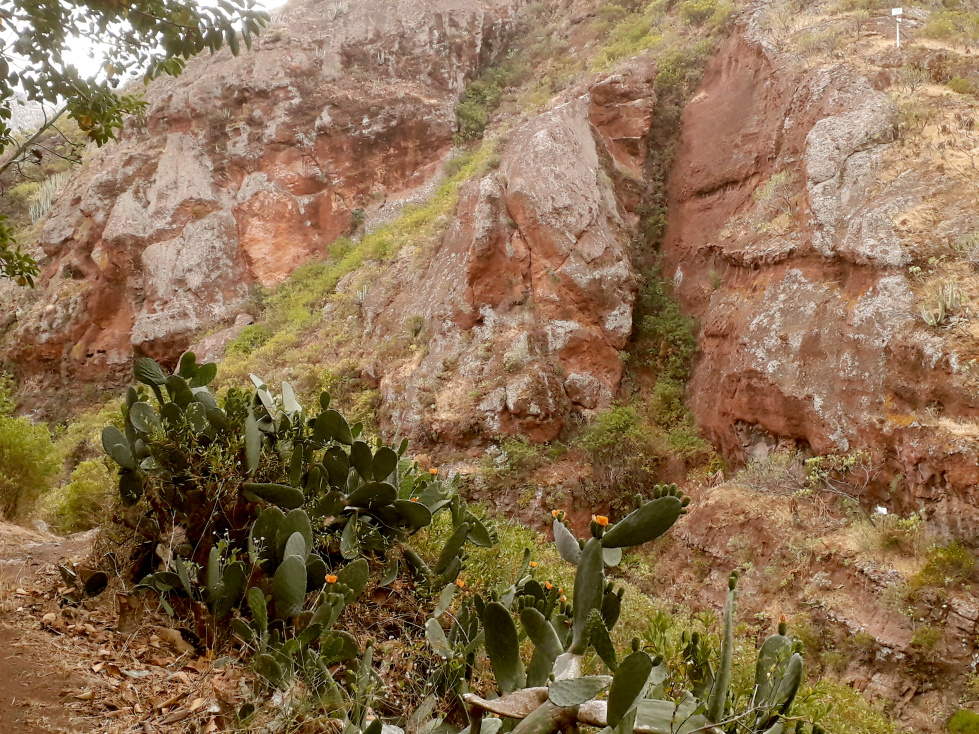 Der Rückweg ist ebenfalls spannend und dauert nicht mehr als 25 Minuten. Man kommt im Talgrund vorbei an den Häusern, die man von oben gesehen hat, einem kleinen Dreschplatz und schließlich in eine enge Schlucht. Oben in den Steilwänden erkennt man einige Felsüberhänge, die schon von den Guanchen als Wohn- und Begräbnisstätten genutzt wurden. Hier im Tal hat man zahlreiche Fundstellen als Beweis dafür entdeckt.