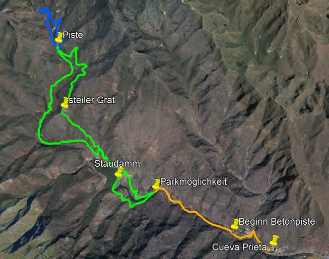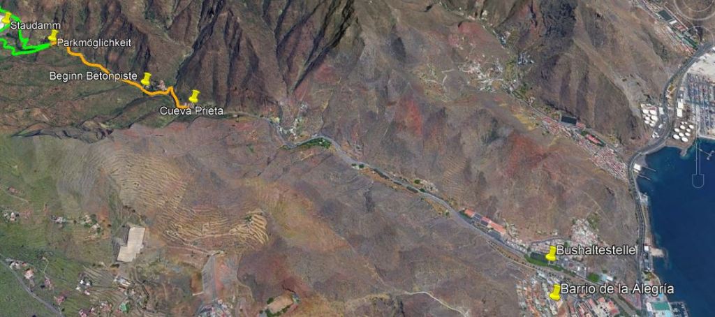Man kann die Wanderung direkt in Barrio de la Alegría beginnen, bis dort hin fahren die Buslinien 905 und 911. Dann muss man aber mehr als 3km auf der Straße in das Tal hinein laufen. Wer mit dem Auto kommt, fährt am Weiler Cueva Prieta vorbei, bis es nicht mehr weiter geht, auf der Straße, die später zu einer Betonpiste wird. Dort wo ein Schild darauf hinweist, dass es nur noch für Anwohner weiter geht, kann man das Auto abstellen. Hier zweigt auch ein kleiner Feldweg nach links ab, auf dem man später zurück kommt.