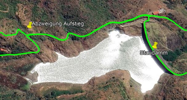 Nachdem sich die Schlucht wieder öffnet, sieht man schon den Stausee und kommt bald wieder zurück zur Staumauer. Es gibt die Möglichkeit, über die Mauer zur anderen Talseite zu gehen. Das Betreten des Staudamms ist offiziell verboten, ein Schild weist deutlich darauf hin. Wer sich daran hält, geht auf demselben Weg zurück. Wer sich traut, über den Damm zu gehen – es ist völlig ungefährlich – findet auf der anderen Seite einen steilen Pfad hinunter zu dem weißen Wasserhaus und von dort entlang einer Wasserleitung eine Piste hinunter bis zur Straße.