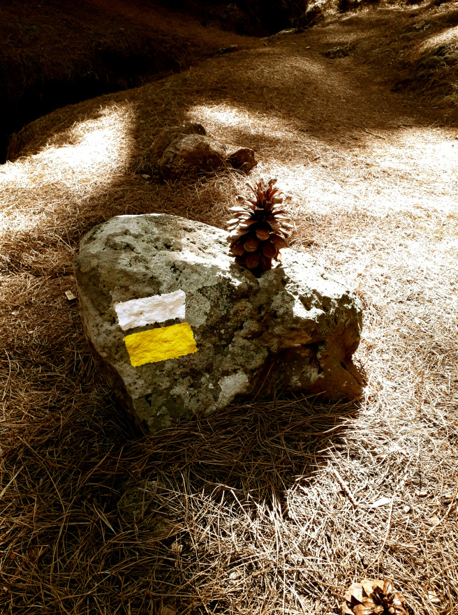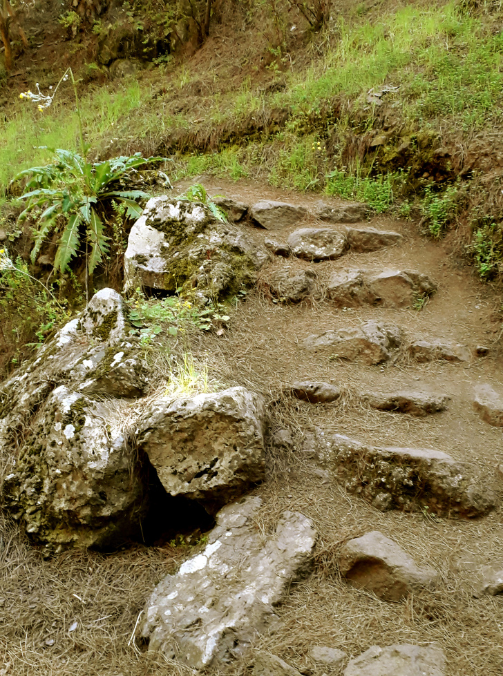 Der Anfangspunkt und die Anfahrt sind unten beschrieben. Neben einem Mäuerchen mit gelb-weißer Markierung geht es auf einem Pfad in den Wald hinein, und sogleich links herum bergauf. Der Weg ist am Anfang etwas steil, teilweise gibt es Treppen. Nach etwa 300m geht es in ein Tälchen hinein, wo der Weg nach links dreht. Noch einmal geht es bergauf, aber je höher man kommt, umso flacher wird es. Nach genau einem Kilometer erreicht man die obere Las-Raices-Straße und geht parallel zu ihr nach links. 200m weiter ist man am oberen Parkplatz.