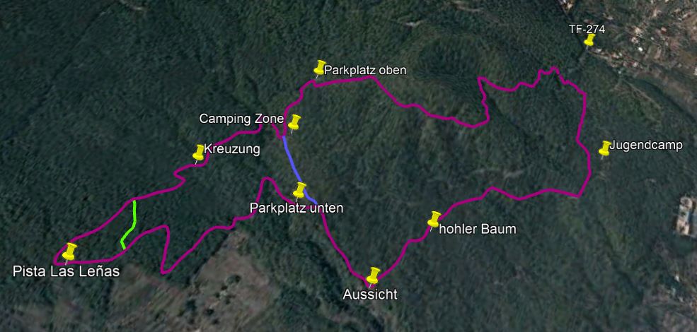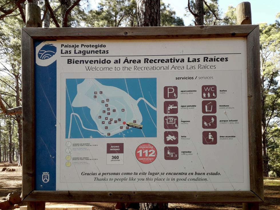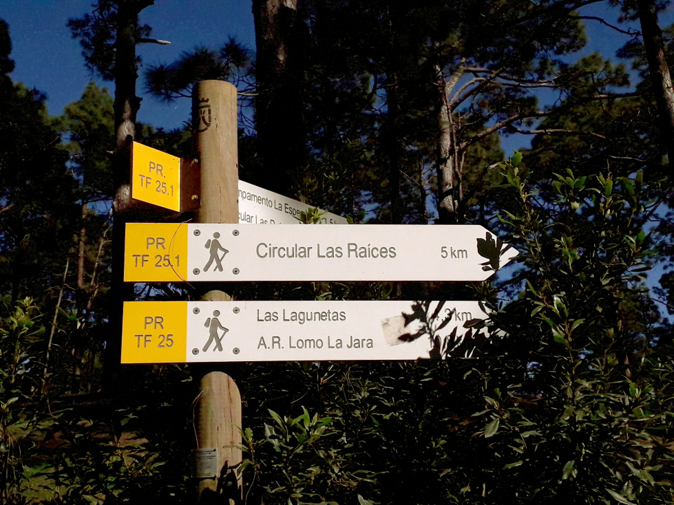 Diese schöne kleine Wanderrunde führt auf schattigen Wegen durch den Wald. Die offizielle Route TF 25.1 ist perfekt ausgeschildert als „Circular Las Raices“ und ist etwa 5km lang. Man kann sie an einem der beiden Parkplätze beginnen. Dort ist es aber oft sehr voll, besonders am Wochenende. Deshalb ist hier ein anderer Einstiegspunkt beschrieben, der auch den Vorteil hat, dass der kräftige Anstieg gleich am Beginn der Wanderung liegt.