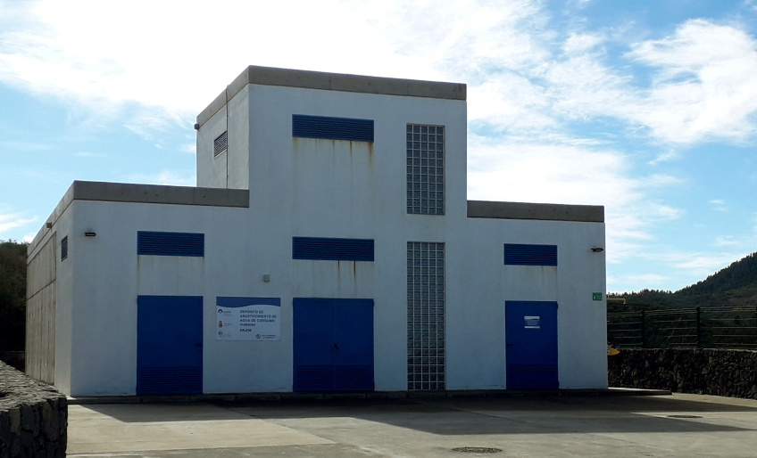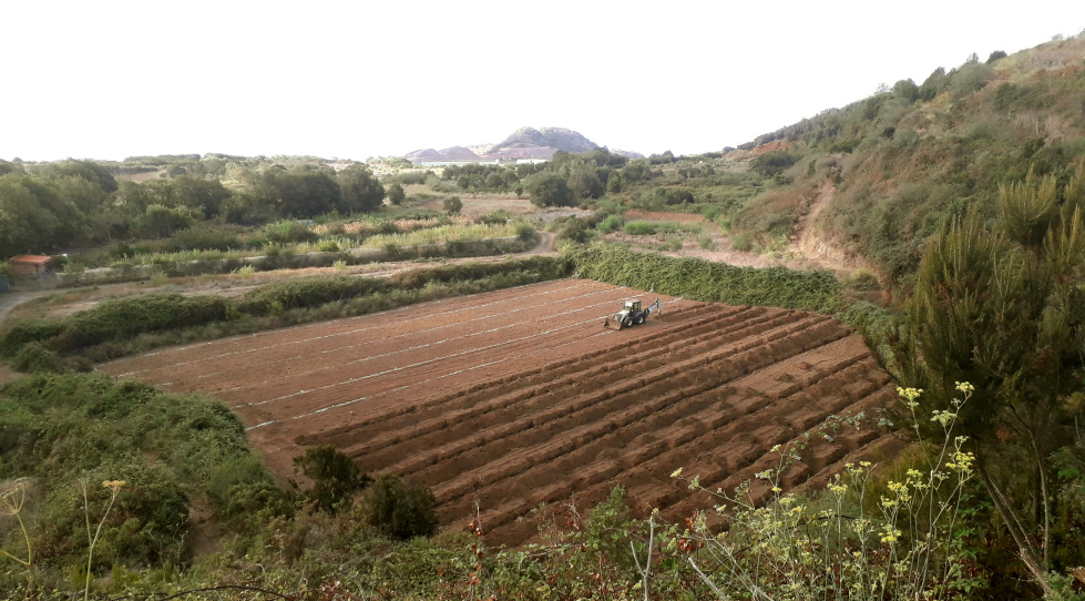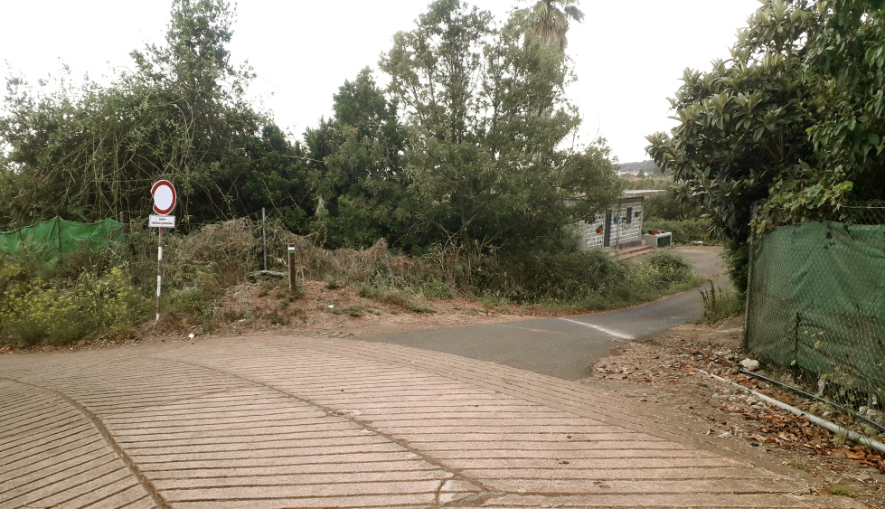 Nun folgt man immer diesem Feldweg und kommt nach 400m an einem roten Haus vorbei, danach macht er einen Rechtsbogen und stößt auf eine Betonpiste. Sie ist die geradlinige Verbindung zwischen Erjos und El Tanque, auf ihr hätte man auch direkt von Erjos aus herunter laufen können.