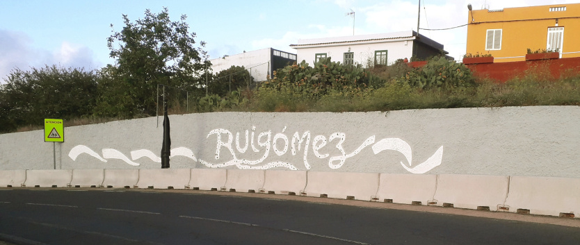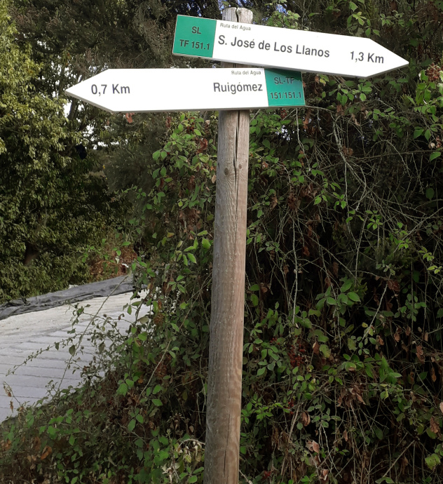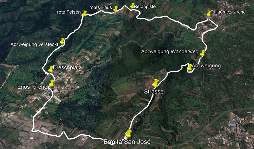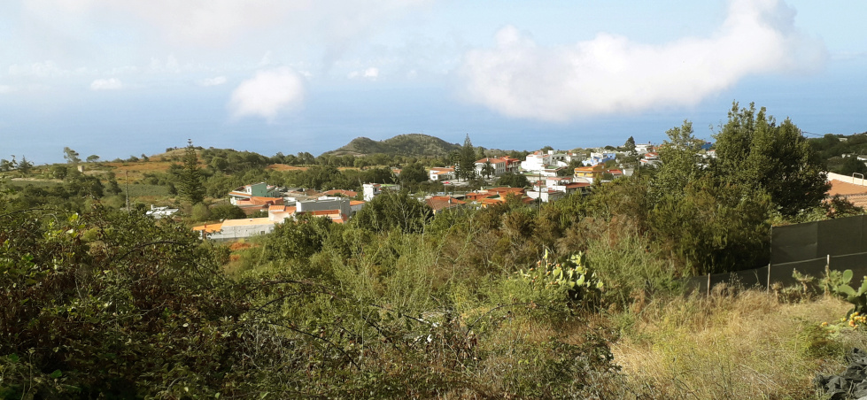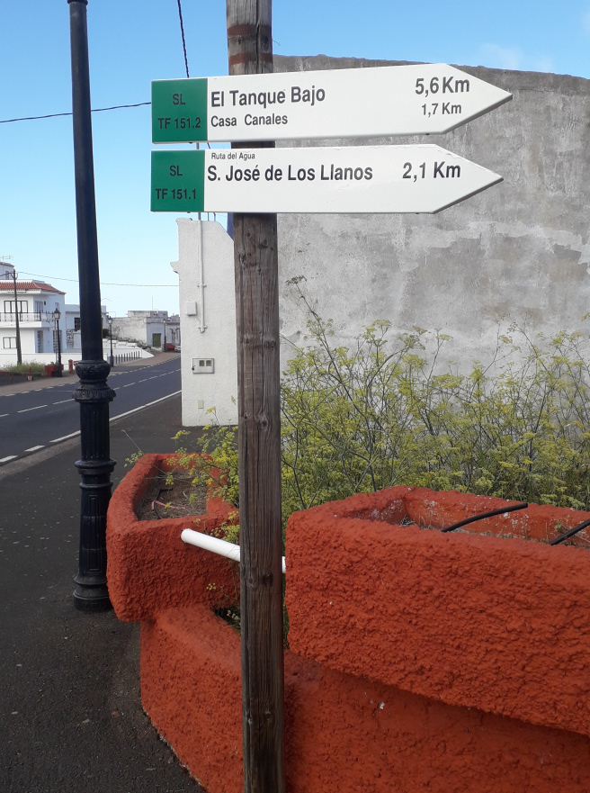 Bei der kleinen Dorfkirche und dem Festplatz gibt es Parkmöglichkeiten. Genau gegenüber der Kirche ist der lokale Wanderweg SL TF-151.1 ausgeschildert in Richtung San José de los Llanos. Nach 100m biegt man rechts ab und kommt auf die Pista agrícola el Guirre, die hinter den letzten Häusern zu einer steilen Betonpiste wird. Es geht kräftig bergauf. Beim Blick zurück sieht man das Dorf Ruigómez.