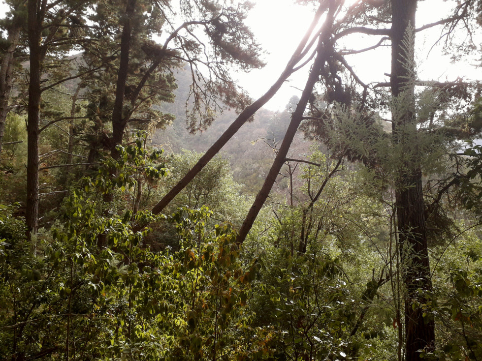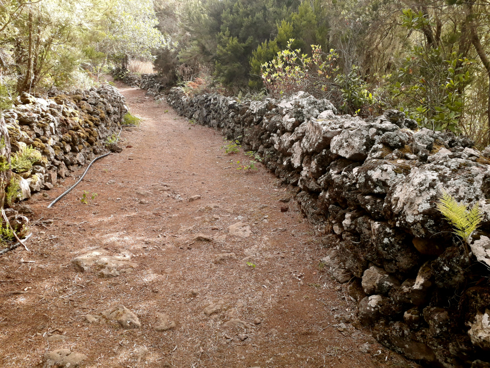 Nach insgesamt 700m zweigt der Wanderweg rechts von der Piste ab. Nun geht man auf einem alten Pfad zwischen Mauern. Es ist nicht mehr ganz so steil, aber dafür etwas felsiger. Bald kommt man in den schattigen Wald. Nach weiteren 250m geht der offizielle Weg geradeaus in die Schlucht hinein, sie heißt Barranco el Guirre, nach einem Raubvogel, der heute aber ausgestorben ist.