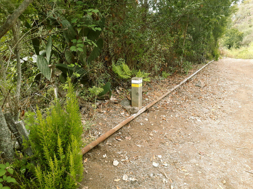 Der Weg würde immer weiter hinunter in den Barranco de los Cochinos führen, aber für den Rückweg nach Ruigómez muss man ein einer Stelle gut aufpassen. Ziemlich genau 500m nach den Dreschplatz steht links am Weg neben einem Wasserrohr ein Holzpfosten mit gelb-weißer Markierung. Schräg gegenüber entdeckt man einen sehr zugewachsenen Pfad ins Gebüsch hinein, der rechtwinklig vom Wanderweg abzweigt.