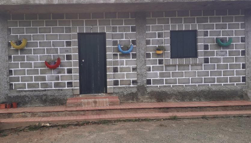 Auf der Piste geht man nach links und sofort wieder nach rechts auf eine Asphaltstraße, vorbei an dem Haus mit den bunten Autoreifen. Das Sträßchen führt zwischen Feldern, Apfelplantagen und mit Fernblick automatisch wieder zur Hauptstraße zurück, die man in der Kurve 200m oberhalb der Kirche erreicht.