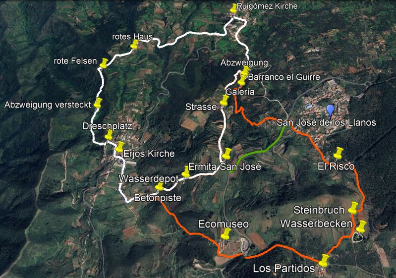 Wer noch eine wesentlich größere Runde laufen kann, folgt hier der im Artikel Geierschlucht beschriebenen Route nach San José de los Llanos und wieder zurück nach Erjos. Man kann auch nur ein Stück in die Schlucht hinein gehen und wieder bis zum Wegweiser zurück.